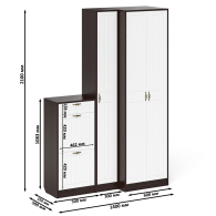 Комплектация состоит из шкафа для одежды и пенала объединенных в единый блок и высокой обувницы. Классический шкаф за распашными дверками которого расположены антресольная полка для головных уборов, горизонтальная штанга и нижняя ниша для обуви. Классический узкий пенал, за распашной дверью которого расположены 4 полки. Сторону открывания двери Вы определяете при сборке, что расширяет возможности удобной меблировки прихожей. Высокая обувница оборудована ящиком для мелочей сверху и двумя отделениями с откидными фасадами для обуви. Для фиксации откидных фасадов используется газлифт мебельный. Максимальная нагрузка составляет 5 кг. Ручки в виде скоб выполнены из металла в цвете бронза. Выдвижной ящик установлен на металлические направляющие, обеспечивающие надёжное прямолинейное движение. Двери закреплены на четырёхшарнирных петлях. Фасады выполнены из МДФ односторонней белой 16 мм. и покрыта плёнкой ПВХ 0,3 мм. белое дерево. Декоративная фрезеровка Прованс служит отличным дополнением к общему светлому тону фасада. Корпуса выполнены из ламинированной ДСП 16 мм., которая имеет гигиенический сертификат Е1 и относится к самой безопасной группе ДСП. Торцы деталей облицованы кромкой ПВХ 2 мм. и 0,4 мм., что улучшает эстетический вид и продлевает срок службы обувнице. На опорах мебели используются пластиковые подпятники, сохраняющие Ваше напольное покрытие от повреждений. Поставляются обувница П-6 две секции с пеналом и шкафом № 28 в разобранном виде в надёжной упаковке, с комплектом сборочной фурнитуры и инструкцией по сборке. Изображения обувницы П-6 две секции с пеналом и шкафом № 28 Вы можете найти выше в начале страницы.