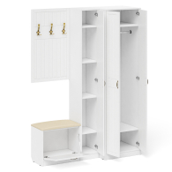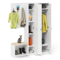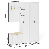 Комплектация состоит из шкафа для одежды и пенала объединенных в единый блок, тумбы с сиденьем и навесной вешалки. Классический шкаф за распашными дверками которого расположены антресольная полка для головных уборов, горизонтальная штанга и нижняя ниша для обуви. Классический узкий пенал, за распашной дверью которого расположены 4 полки. Сторону открывания двери Вы определяете при сборке, что расширяет возможности удобной меблировки прихожей. Компактная маленькая обувница без полок за откидной дверкой. За откидной дверцей достаточно места для нескольких пар обуви. Обувница оборудована мягким сиденьем - ее можно использовать в качестве банкетки с комфортом обуваясь перед выходом. Для фиксации откидных фасадов используется газлифт мебельный. Максимальная нагрузка составляет 5 кг. Классическая прямоугольная настенная вешалка с крючками. Оборудована тремя трехрожковыми крючками для одежды. Глубина вешалки - 16 мм., 9,3 см.- это глубина с учетом крючков. Крепления вешалки к стене в комплектацию не входит. Ручки в виде скоб выполнены из металла в цвете бронза. Двери закреплены на четырёхшарнирных петлях. Фасады выполнены из МДФ односторонней белой 16 мм. и покрыта плёнкой ПВХ 0,3 мм. белое дерево. Декоративная фрезеровка Прованс служит отличным дополнением к общему светлому тону фасада. Корпуса выполнены из ламинированной ДСП 16 мм., которая имеет гигиенический сертификат Е1 и относится к самой безопасной группе ДСП. Торцы деталей облицованы кромкой ПВХ 2 мм. и 0,4 мм., что улучшает эстетический вид и продлевает срок службы обувнице. На опорах мебели используются пластиковые подпятники, сохраняющие Ваше напольное покрытие от повреждений. Поставляются пенал для прихожей с обувницей с вешалкой и шкаф П-6 № 27 в разобранном виде в надёжной упаковке, с комплектом сборочной фурнитуры и инструкцией по сборке. Изображения пенала для прихожей с обувницей с вешалкой и шкафа П-6 № 27 Вы можете найти выше в начале страницы.