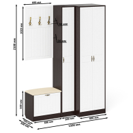 Комплектация состоит из шкафа для одежды и пенала объединенных в единый блок, тумбы с сиденьем и навесной вешалки. Классический шкаф за распашными дверками которого расположены антресольная полка для головных уборов, горизонтальная штанга и нижняя ниша для обуви. Классический узкий пенал, за распашной дверью которого расположены 4 полки. Сторону открывания двери Вы определяете при сборке, что расширяет возможности удобной меблировки прихожей. Компактная маленькая обувница без полок за откидной дверкой. За откидной дверцей достаточно места для нескольких пар обуви. Обувница оборудована мягким сиденьем - ее можно использовать в качестве банкетки с комфортом обуваясь перед выходом. Для фиксации откидных фасадов используется газлифт мебельный. Максимальная нагрузка составляет 5 кг. Классическая прямоугольная настенная вешалка с крючками. Оборудована тремя трехрожковыми крючками для одежды. Глубина вешалки - 16 мм., 9,3 см.- это глубина с учетом крючков. Крепления вешалки к стене в комплектацию не входит. Ручки в виде скоб выполнены из металла в цвете бронза. Двери закреплены на четырёхшарнирных петлях. Фасады выполнены из МДФ односторонней белой 16 мм. и покрыта плёнкой ПВХ 0,3 мм. белое дерево. Декоративная фрезеровка Прованс служит отличным дополнением к общему светлому тону фасада. Корпуса выполнены из ламинированной ДСП 16 мм., которая имеет гигиенический сертификат Е1 и относится к самой безопасной группе ДСП. Торцы деталей облицованы кромкой ПВХ 2 мм. и 0,4 мм., что улучшает эстетический вид и продлевает срок службы обувнице. На опорах мебели используются пластиковые подпятники, сохраняющие Ваше напольное покрытие от повреждений. Поставляются пенал для прихожей с обувницей с вешалкой и шкаф П-6 № 27 в разобранном виде в надёжной упаковке, с комплектом сборочной фурнитуры и инструкцией по сборке. Изображения пенала для прихожей с обувницей с вешалкой и шкафа П-6 № 27 Вы можете найти выше в начале страницы.