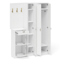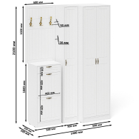 Комплектация состоит из шкафа для одежды и пенала объединенных в единый блок, высокой обувницы и навесной вешалки. Классический шкаф за распашными дверками которого расположены антресольная полка для головных уборов, горизонтальная штанга и нижняя ниша для обуви. Классический узкий пенал, за распашной дверью которого расположены 4 полки. Сторону открывания двери Вы определяете при сборке, что расширяет возможности удобной меблировки прихожей. Высокая обувница оборудована ящиком для мелочей сверху и двумя отделениями с откидными фасадами для обуви. Для фиксации откидных фасадов используется газлифт мебельный. Максимальная нагрузка составляет 5 кг. Прямоугольная настенная вешалка с крючками. Оборудована тремя трехрожковыми крючками для одежды. Глубина вешалки - 16 мм., 9,3 см.- это глубина с учетом крючков. Крепления вешалки к стене в комплектацию не входит. Ручки в виде скоб выполнены из металла в цвете бронза. Выдвижной ящик установлен на металлические направляющие, обеспечивающие надёжное прямолинейное движение. Двери закреплены на четырёхшарнирных петлях. Фасады выполнены из МДФ односторонней белой 16 мм. и покрыта плёнкой ПВХ 0,3 мм. белое дерево. Декоративная фрезеровка Прованс служит отличным дополнением к общему светлому тону фасада. Корпуса выполнены из ламинированной ДСП 16 мм., которая имеет гигиенический сертификат Е1 и относится к самой безопасной группе ДСП. Торцы деталей облицованы кромкой ПВХ 2 мм. и 0,4 мм., что улучшает эстетический вид и продлевает срок службы обувнице. На опорах мебели используются пластиковые подпятники, сохраняющие Ваше напольное покрытие от повреждений. Поставляются мебель в прихожую П-6 № 30 в разобранном виде в надёжной упаковке, с комплектом сборочной фурнитуры и инструкцией по сборке. Изображения мебели в прихожую П-6 № 30 Вы можете найти выше в начале страницы.
