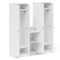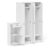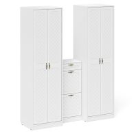 Комплектация состоит из двух шкафов для одежды объединенных в единый блок и высокой обувницы. Классический шкаф (в комплектации 2 единицы) за распашными дверками которого расположены антресольная полка для головных уборов, горизонтальная штанга и нижняя ниша для обуви. Высокая обувница оборудована ящиком для мелочей сверху и двумя отделениями с откидными фасадами для обуви. Для фиксации откидных фасадов используется газлифт мебельный. Максимальная нагрузка составляет 5 кг. Ручки в виде скоб выполнены из металла в цвете бронза. Выдвижной ящик установлен на металлические направляющие, обеспечивающие надёжное прямолинейное движение. Двери закреплены на четырёхшарнирных петлях. Фасады выполнены из МДФ односторонней белой 16 мм. и покрыта плёнкой ПВХ 0,3 мм. белое дерево. Декоративная фрезеровка Ромб служит отличным дополнением к общему светлому тону фасада. Корпуса выполнены из ламинированной ДСП 16 мм., которая имеет гигиенический сертификат Е1 и относится к самой безопасной группе ДСП. Торцы деталей облицованы кромкой ПВХ 2 мм. и 0,4 мм., что улучшает эстетический вид и продлевает срок службы обувнице. На опорах мебели используются пластиковые подпятники, сохраняющие Ваше напольное покрытие от повреждений. Поставляются тумба для обуви две секции и два шкафа в прихожую П-6 № 13 в разобранном виде в надёжной упаковке, с комплектом сборочной фурнитуры и инструкцией по сборке. Изображения тумбы для обуви две секции и двух шкафов в прихожую П-6 № 13 Вы можете найти выше в начале страницы.