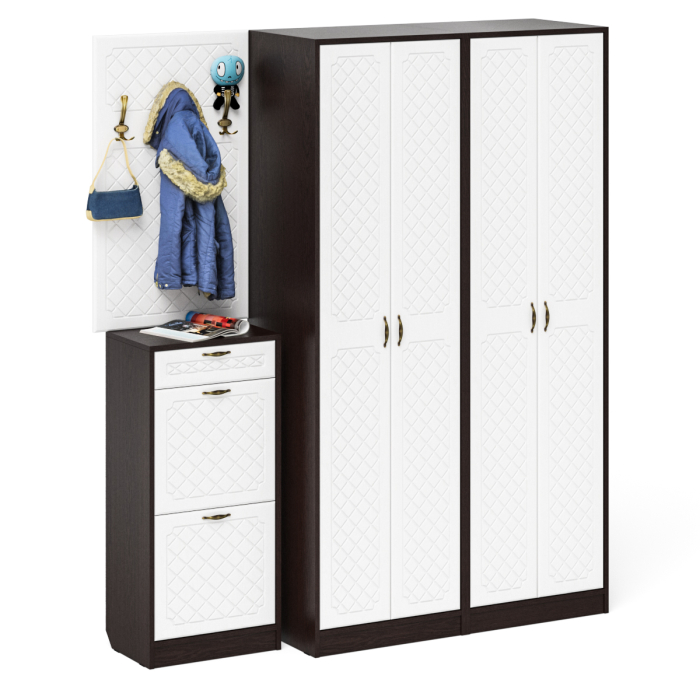 Комплектация состоит из двух шкафов для одежды объединенных в единый блок, высокой обувницы и навесной вешалки. Классический шкаф (в комплектации 2 единицы) за распашными дверками которого расположены антресольная полка для головных уборов, горизонтальная штанга и нижняя ниша для обуви. Высокая обувница оборудована ящиком для мелочей сверху и двумя отделениями с откидными фасадами для обуви. Для фиксации откидных фасадов используется газлифт мебельный. Максимальная нагрузка составляет 5 кг. Классическая прямоугольная настенная вешалка с крючками. Оборудована тремя трехрожковыми крючками для одежды. Глубина вешалки - 16 мм., 9,3 см.- это глубина с учетом крючков. Крепления вешалки к стене в комплектацию не входит. Ручки в виде скоб выполнены из металла в цвете бронза. Выдвижной ящик установлен на металлические направляющие, обеспечивающие надёжное прямолинейное движение. Двери закреплены на четырёхшарнирных петлях. Фасады выполнены из МДФ односторонней белой 16 мм. и покрыта плёнкой ПВХ 0,3 мм. белое дерево. Декоративная фрезеровка Ромб служит отличным дополнением к общему светлому тону фасада. Корпуса выполнены из ламинированной ДСП 16 мм., которая имеет гигиенический сертификат Е1 и относится к самой безопасной группе ДСП. Торцы деталей облицованы кромкой ПВХ 2 мм. и 0,4 мм., что улучшает эстетический вид и продлевает срок службы обувнице. На опорах мебели используются пластиковые подпятники, сохраняющие Ваше напольное покрытие от повреждений. Поставляются прихожая компоновка № 15 в разобранном виде в надёжной упаковке, с комплектом сборочной фурнитуры и инструкцией по сборке. Изображения прихожей компоновка № 15 Вы можете найти выше в начале страницы.