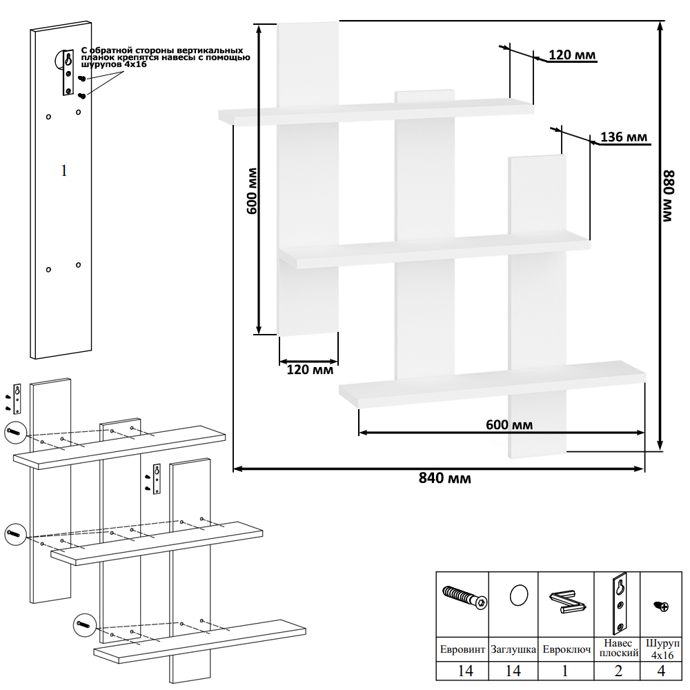 Представляет из себя 6 планок соединеных по диагонали - 3 вертикальных и 3 полочки. На крайних вертикальных планках с обратной стороны есть углубления, впритык к которым крепятся навесы с помощию шурупов 4х16. Навесы и шурупы входят в комплект поставки, фурнитура (саморез, дюпель) непосредственно для крепления полки к стене НЕТ. Выполнена мебель из качественной, экологически чистой ламинированной ДСП 16 мм. класса Е1, разрешённого для детской мебели. В производстве использована современная фурнитура, отличающаяся высокой надёжностью и долговечностью. Поставляется в разобранном виде в надёжной упаковке, с комплектом сборочной фурнитуры и инструкцией по сборке. Изображения полки СВК-5 Вы можете найти выше в начале страницы.