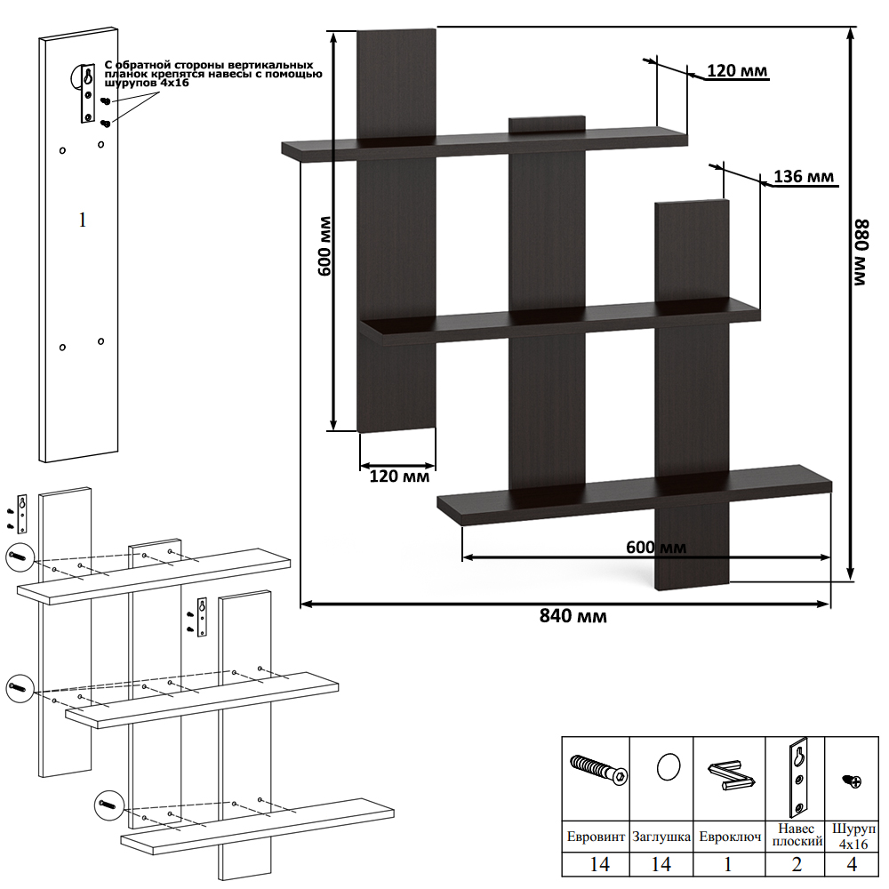 Представляет из себя 6 планок соединеных по диагонали - 3 вертикальных и 3 полочки. На крайних вертикальных планках с обратной стороны есть углубления, впритык к которым крепятся навесы с помощию шурупов 4х16. Навесы и шурупы входят в комплект поставки, фурнитура (саморез, дюпель) непосредственно для крепления полки к стене НЕТ. Выполнена мебель из качественной, экологически чистой ламинированной ДСП 16 мм. класса Е1, разрешённого для детской мебели. В производстве использована современная фурнитура, отличающаяся высокой надёжностью и долговечностью. Поставляется в разобранном виде в надёжной упаковке, с комплектом сборочной фурнитуры и инструкцией по сборке. Изображения полки СВК-5 Вы можете найти выше в начале страницы.