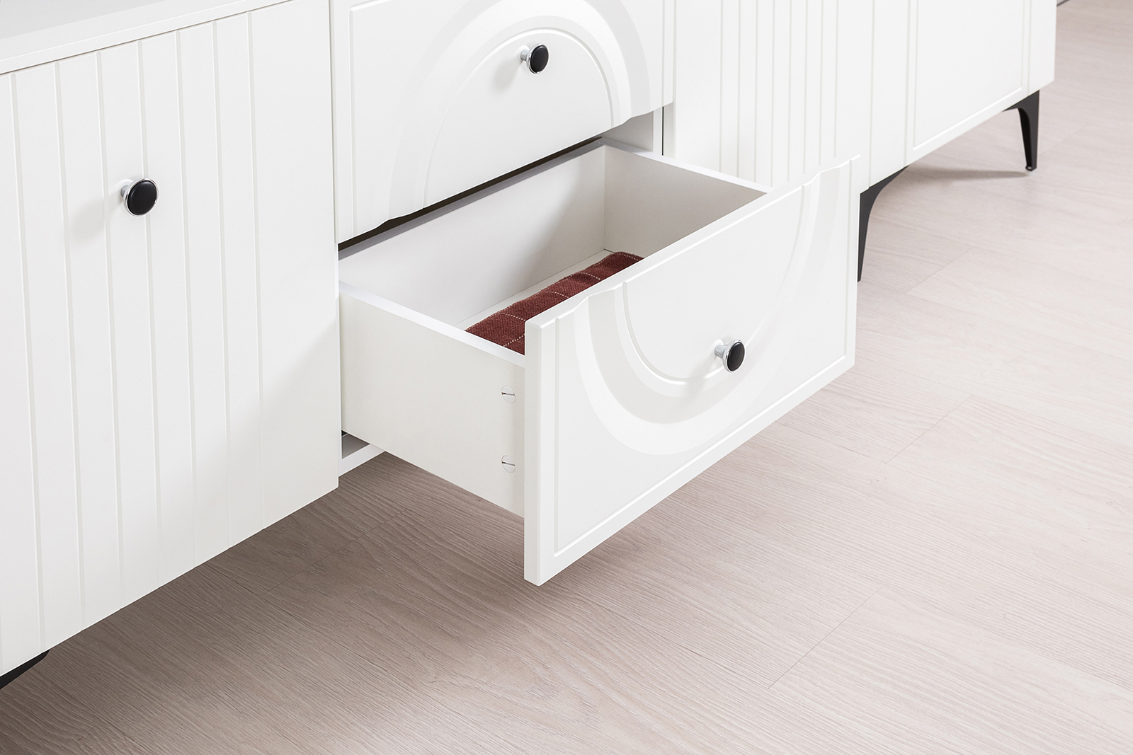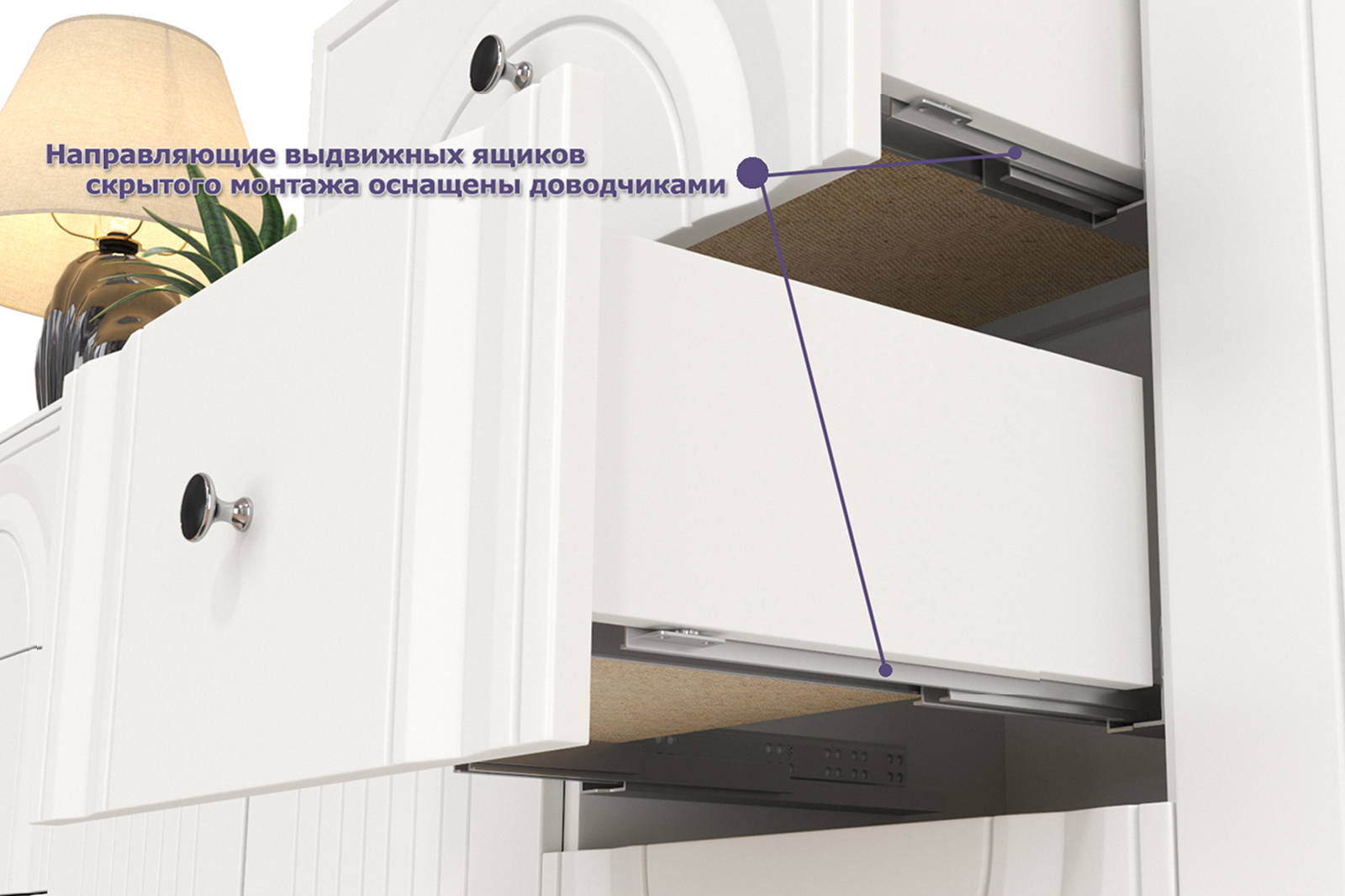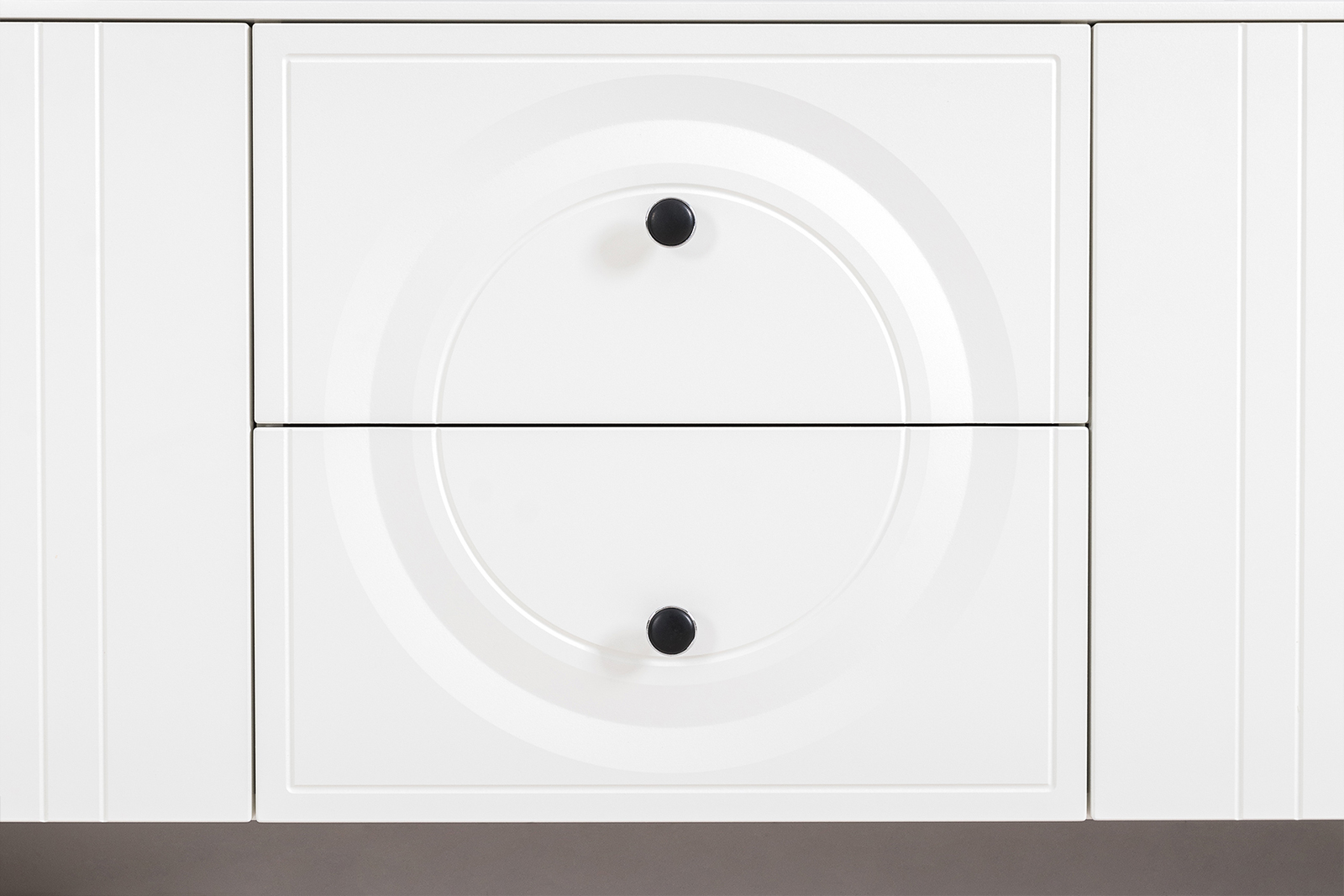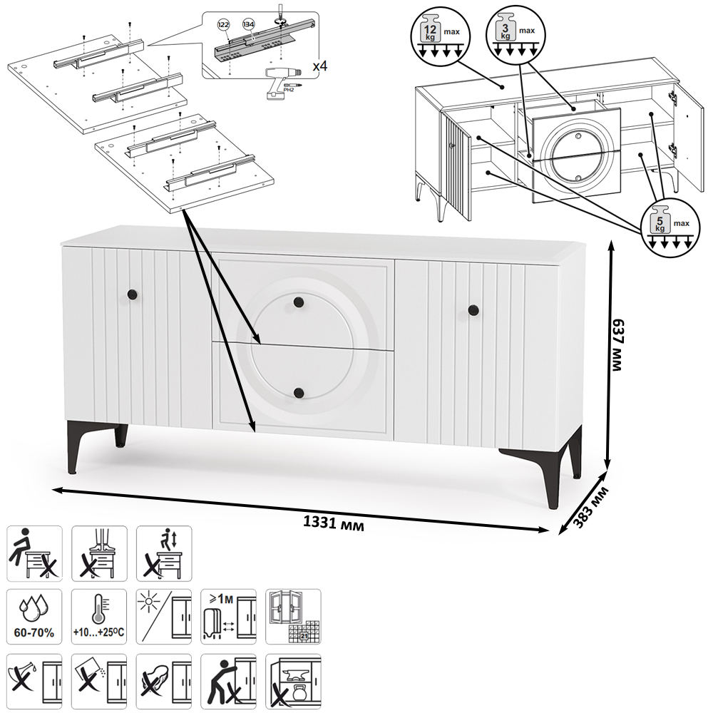 Графичное и стильное сочетание белоснежных фасадов и черных деталей эффектно расставляет акценты на мебели. Геометричный рисунок фрезеровки на белоснежных фасадах даёт развитый светотеневой рисунок. Тумба под ТВ Валенсия 16.45 оснащена двумя выдвижными ящиками по центру и нишами с полкой за распашными дверками по краям. Ящики тумбы под ТВ установлены на направляющие скрытого монтажа с доводчиками. Двери закреплены на четырехшарнирных петлях. Установлена тумба под ТВ на высокие ножки, что делает конструкцию лёгкой и воздушной и практичной в плане уборки. Над тумбой расположены две навесные открытые полки с задней панелью из МДФ. Полочка и задняя панель соединены металлическими кронштейнами черного цвета, усиливающие конструкцию и служащими креплениями к стене. Мебель выполнена из экологически чистой ламинированной ДСП 16 мм, класса эмиссии Е1, детали обработаны ПВХ-кромкой. Фасады из МДФ с матовой ПВХ-плёнкой. Такое решение делает мебель визуально более "мягкой", комфортной и расслабляющей, что особенно актуально для спальни. Поставляется в разобранном виде в надёжной упаковке, с комплектом сборочной фурнитуры и инструкцией по сборке. Тумба для ТВ с двумя навесными полками Валенсия № 51 - элемент из модульного набора мебели Валенсия.