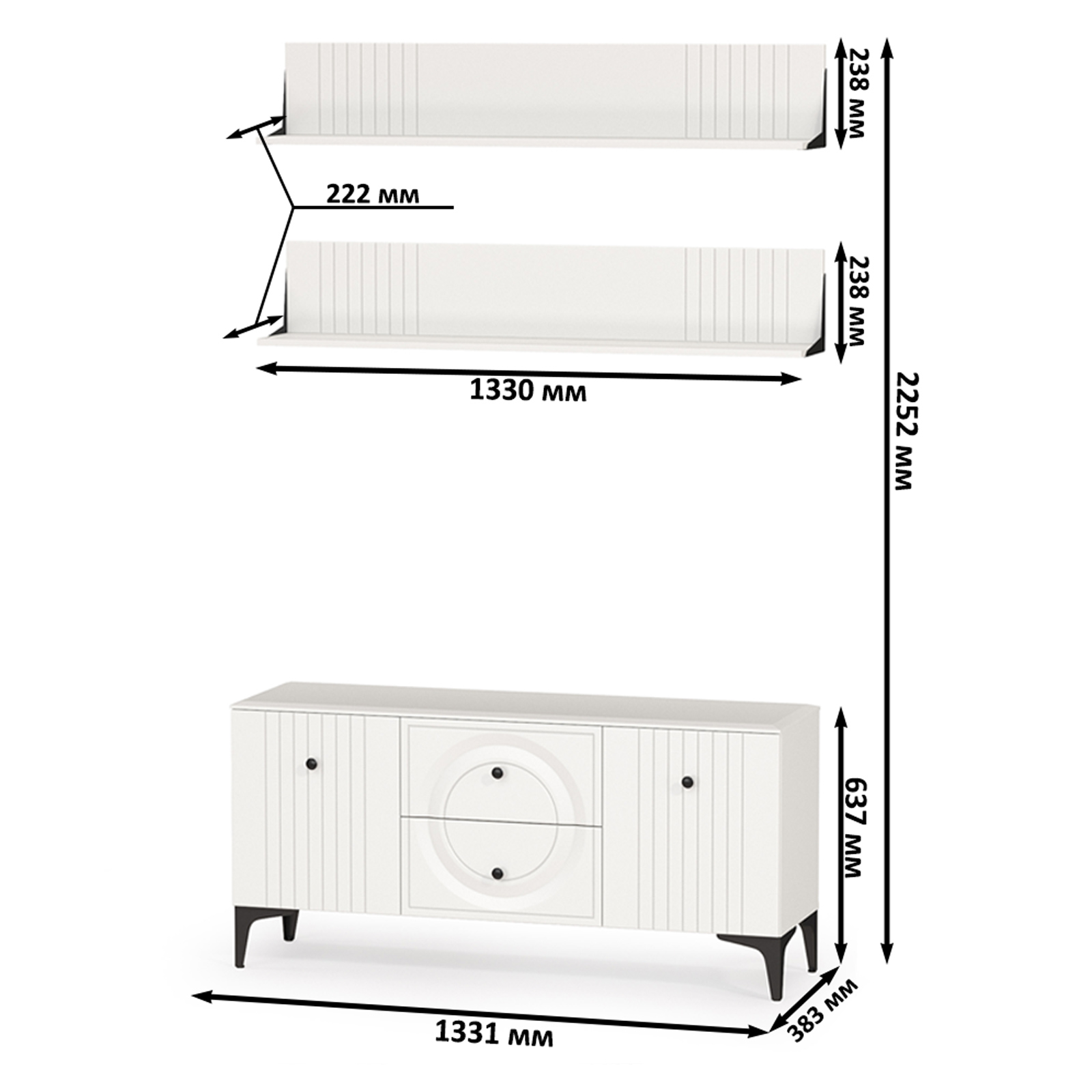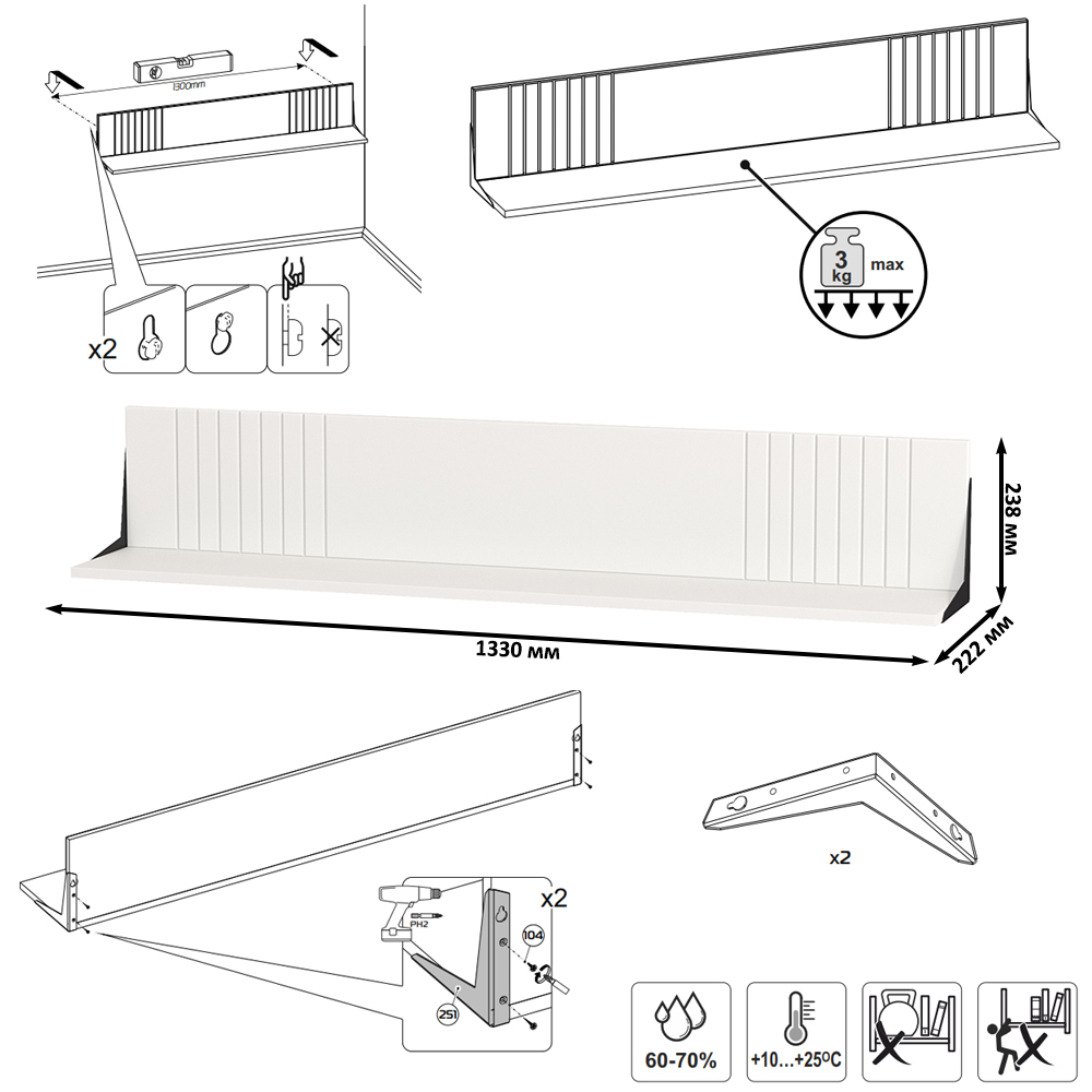 полки - 133х22,2х23,8 см (в комп. 2 ед.).