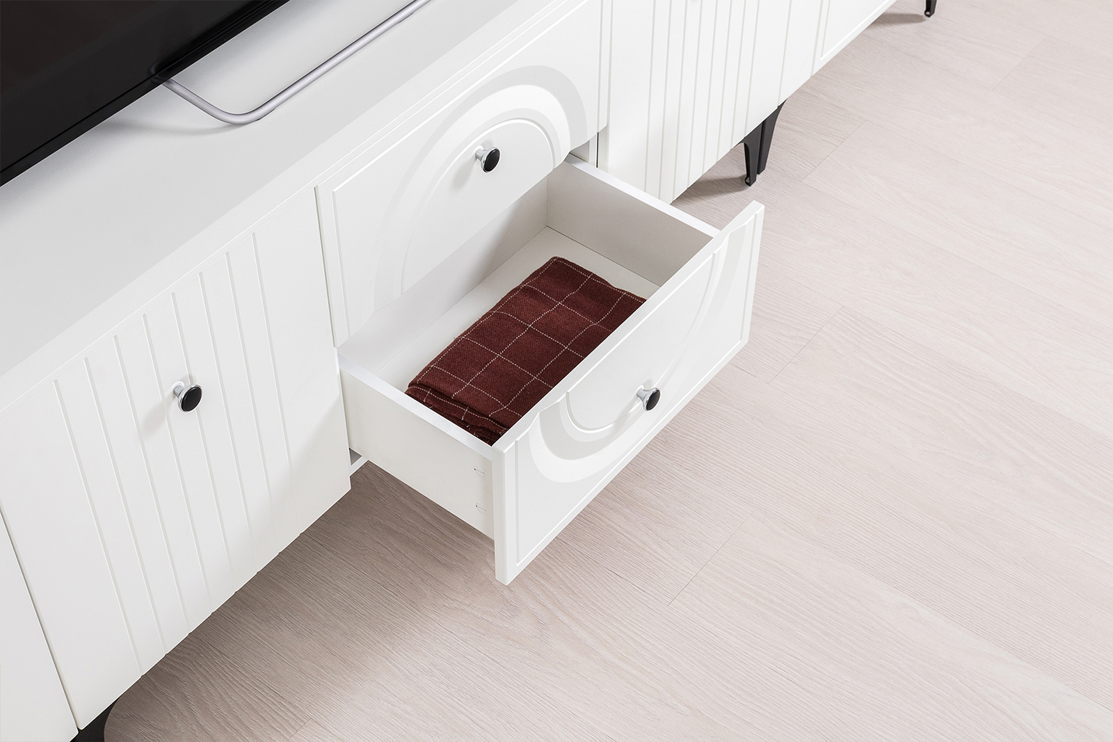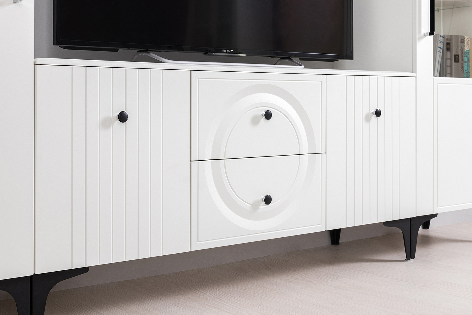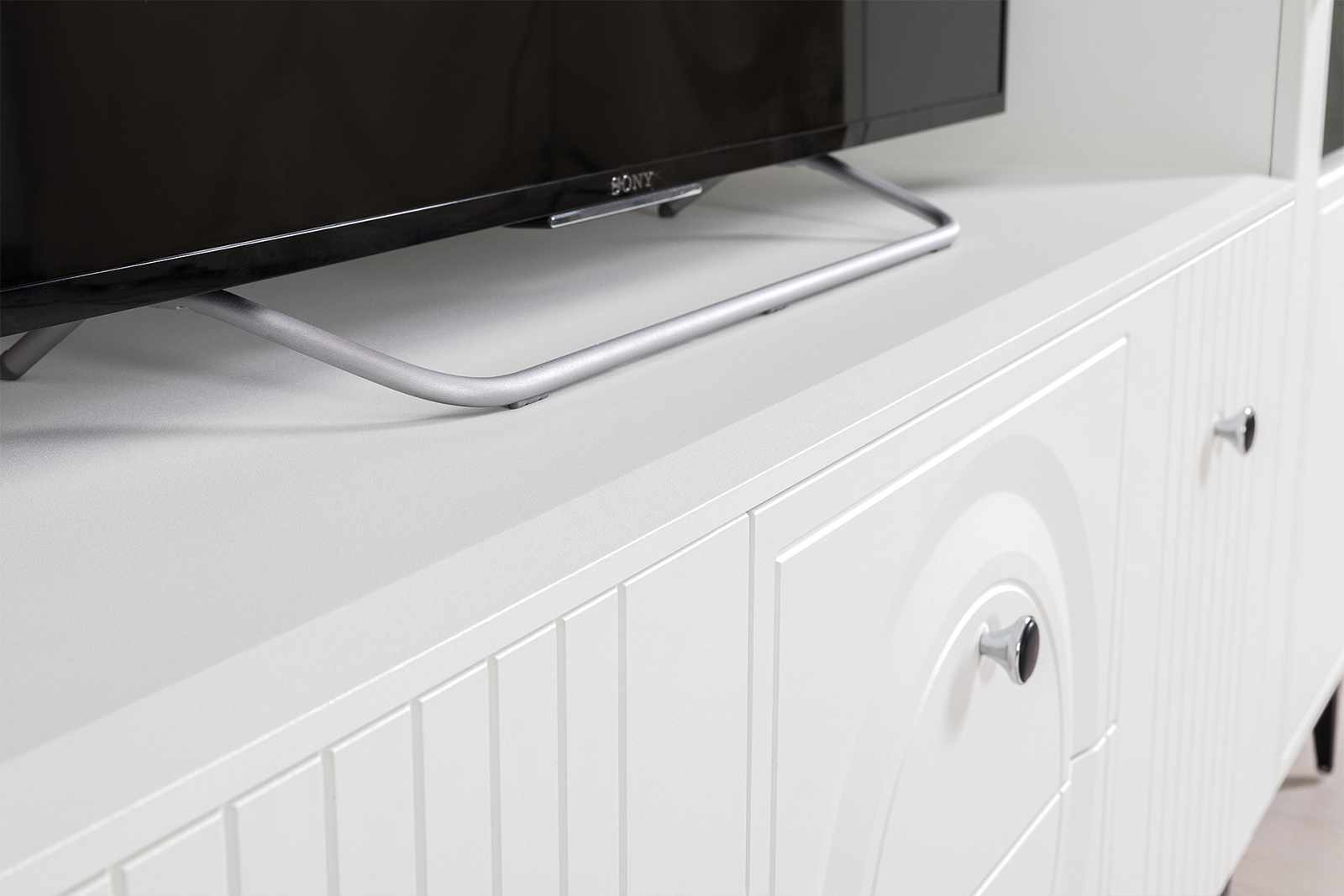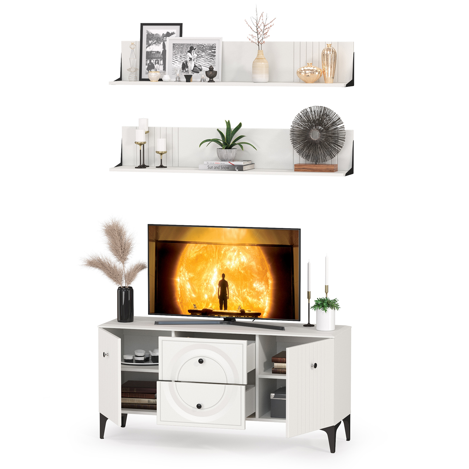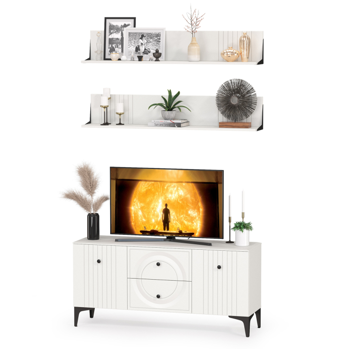 Тумба для ТВ с двумя навесными полками Валенсия № 51 - стильный минимальный набор для светлой гостиной в популярном стиле ар-деко.