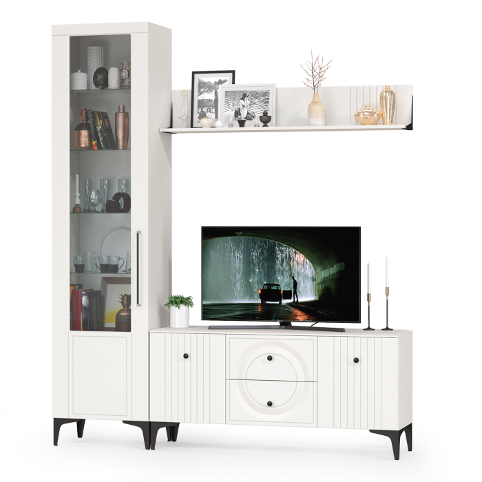ТВ-тумба с пеналом и навесной полкой Валенсия № 55 - стильный набор для светлой гостиной в популярном стиле ар-деко.