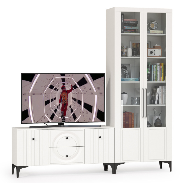 Графичное и стильное сочетание белоснежных фасадов и черных деталей эффектно расставляет акценты на мебели. Геометричный рисунок фрезеровки на белоснежных фасадах даёт развитый светотеневой рисунок. Комплектация состоит из ТВ-тумбы Валенсия 16.45 и серванта Валенсия 13.217. Тумба под ТВ Валенсия 16.45 оснащена двумя выдвижными ящиками по центру и нишами с полкой за распашными дверками по краям. Двухдверный сервант Валенсия 13.217 оснащен стеклянными вставками в дверях. Можно использовать как книжный и как витрину для наград, фотографий, поделок или элементов декора. За распашными дверями расположены 6 полок. Ящики установлены на направляющие скрытого монтажа с доводчиками. Двери закреплены на четырехшарнирных петлях. Установлена мебель на высокие ножки, что делает конструкцию лёгкой и воздушной и практичной в плане уборки. Мебель выполнена из экологически чистой ламинированной ДСП 16 мм, класса эмиссии Е1, детали обработаны ПВХ-кромкой. Фасады из МДФ с матовой ПВХ-плёнкой. Такое решение делает мебель визуально более ""мягкой"", комфортной и расслабляющей, что особенно актуально для спальни. Поставляется в разобранном виде в надёжной упаковке, с комплектом сборочной фурнитуры и инструкцией по сборке. ТВ-тумба и сервант Валенсия № 57 - элементы из модульного набора мебели Валенсия.