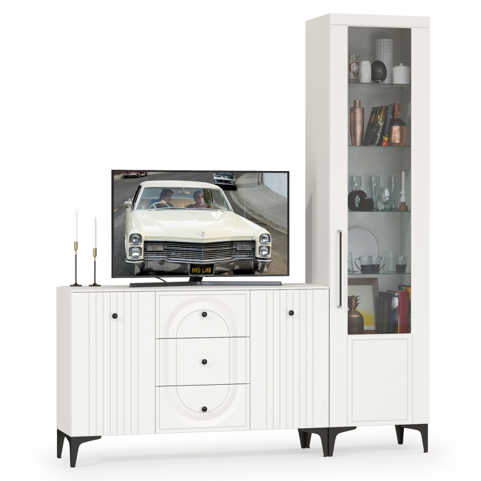 Пенал со стеклом и комод-ТВ-тумба Валенсия № 92 - стильный набор для светлой гостиной в популярном стиле ар-деко.