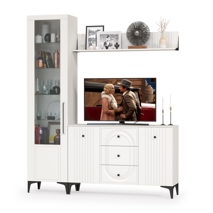Графичное и стильное сочетание белоснежных фасадов и черных деталей эффектно расставляет акценты на мебели. Геометричный рисунок фрезеровки на белоснежных фасадах даёт развитый светотеневой рисунок. Комплектация состоит из комод-тумбы Валенсия 13.309, пенала Валенсия 13.218 и навесной полкой Валенсия 16.481. Широкий комод с распашными дверками по бокам и тремя выдвижными ящиками в центре - вместительный и функциональный. Можно использовать как ТВ-тумбу. Над комодом расположена навесная открытая полка с задней панелью из МДФ. Полочка и задняя панель соединены металлическими кронштейнами черного цвета, усиливающие конструкцию и служащими креплениями к стене. Пенал украшен оригинальной стеклянной вставкой на фасаде, за которой расположены стеклянные полки. За дверкой расположены 6 полок - четыре верхние полочки выполнены из стекла, нижние две из ЛДСП. Универсальная сборка - сторону открывания двери Вы определяете при сборке. Ящики установлены на направляющие скрытого монтажа с доводчиками. Двери закреплены на четырехшарнирных петлях. Установлена мебель на высокие ножки, что делает конструкцию лёгкой и воздушной и практичной в плане уборки. Мебель выполнена из экологически чистой ламинированной ДСП 16 мм, класса эмиссии Е1, детали обработаны ПВХ-кромкой. Фасады из МДФ с матовой ПВХ-плёнкой. Такое решение делает мебель визуально более ""мягкой"", комфортной и расслабляющей, что особенно актуально для спальни. Поставляется в разобранном виде в надёжной упаковке, с комплектом сборочной фурнитуры и инструкцией по сборке. Комод-тумба под ТВ с полкой и пенал со стеклом Валенсия № 93 - элементы из модульного набора мебели Валенсия.