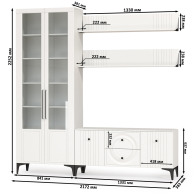 Графичное и стильное сочетание белоснежных фасадов и черных деталей эффектно расставляет акценты на мебели. Геометричный рисунок фрезеровки на белоснежных фасадах даёт развитый светотеневой рисунок. Комплектация состоит из ТВ-тумбы Валенсия 16.45, серванта Валенсия 13.217 и двумя навесными полками Валенсия 16.481. Тумба под ТВ Валенсия 16.45 оснащена двумя выдвижными ящиками по центру и нишами с полкой за распашными дверками по краям. Над тумбой расположены две навесные открытые полки с задней панелью из МДФ. Полочка и задняя панель, каждой соединены металлическими кронштейнами черного цвета, усиливающие конструкцию и служащими креплениями к стене. Двухдверный сервант Валенсия 13.217 оснащен стеклянными вставками в дверях. Сервант можно использовать как книжный шкаф и как витрину для наград, фотографий, поделок или элементов декора. За распашными дверями расположены 6 полок. Ящики установлены на направляющие скрытого монтажа с доводчиками. Двери закреплены на четырехшарнирных петлях. Установлена мебель на высокие ножки, что делает конструкцию лёгкой и воздушной и практичной в плане уборки. Мебель выполнена из экологически чистой ламинированной ДСП 16 мм, класса эмиссии Е1, детали обработаны ПВХ-кромкой. Фасады из МДФ с матовой ПВХ-плёнкой. Такое решение делает мебель визуально более ""мягкой"", комфортной и расслабляющей, что особенно актуально для спальни. Поставляется в разобранном виде в надёжной упаковке, с комплектом сборочной фурнитуры и инструкцией по сборке. Сервант со стеклом и ТВ-тумба с двумя верхними полками Валенсия № 59 - элементы из модульного набора мебели Валенсия.