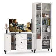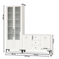 Графичное и стильное сочетание белоснежных фасадов и черных деталей эффектно расставляет акценты на мебели. Геометричный рисунок фрезеровки на белоснежных фасадах даёт развитый светотеневой рисунок. Комплектация состоит из комода Валенсия 13.309 и серванта Валенсия 13.217. Широкий комод с распашными дверками по бокам и тремя выдвижными ящиками в центре - вместительный и функциональный. Можно использовать как ТВ-тумбу. Двухдверный сервант Валенсия 13.217 оснащен стеклянными вставками в дверях. Можно использовать как книжный шкаф и как витрину для наград, фотографий, поделок или элементов декора. За распашными дверями серванта расположены 6 полок. Ящики установлены на направляющие скрытого монтажа с доводчиками. Двери закреплены на четырехшарнирных петлях. Установлена мебель на высокие ножки, что делает конструкцию лёгкой и воздушной и практичной в плане уборки. Мебель выполнена из экологически чистой ламинированной ДСП 16 мм, класса эмиссии Е1, детали обработаны ПВХ-кромкой. Фасады из МДФ с матовой ПВХ-плёнкой. Такое решение делает мебель визуально более ""мягкой"", комфортной и расслабляющей, что особенно актуально для спальни. Поставляется в разобранном виде в надёжной упаковке, с комплектом сборочной фурнитуры и инструкцией по сборке.