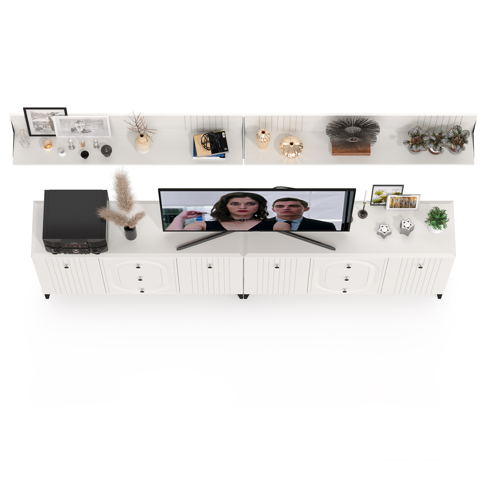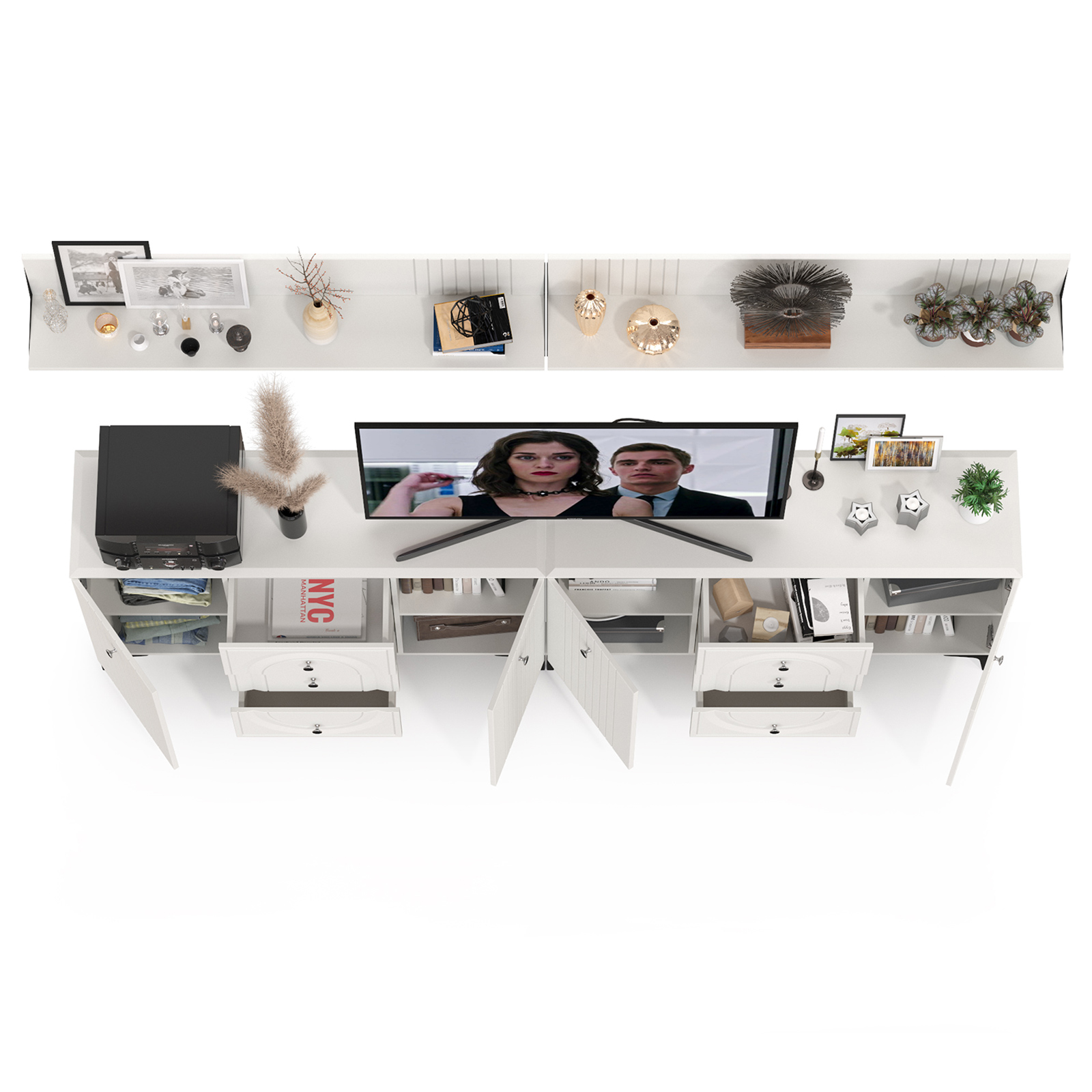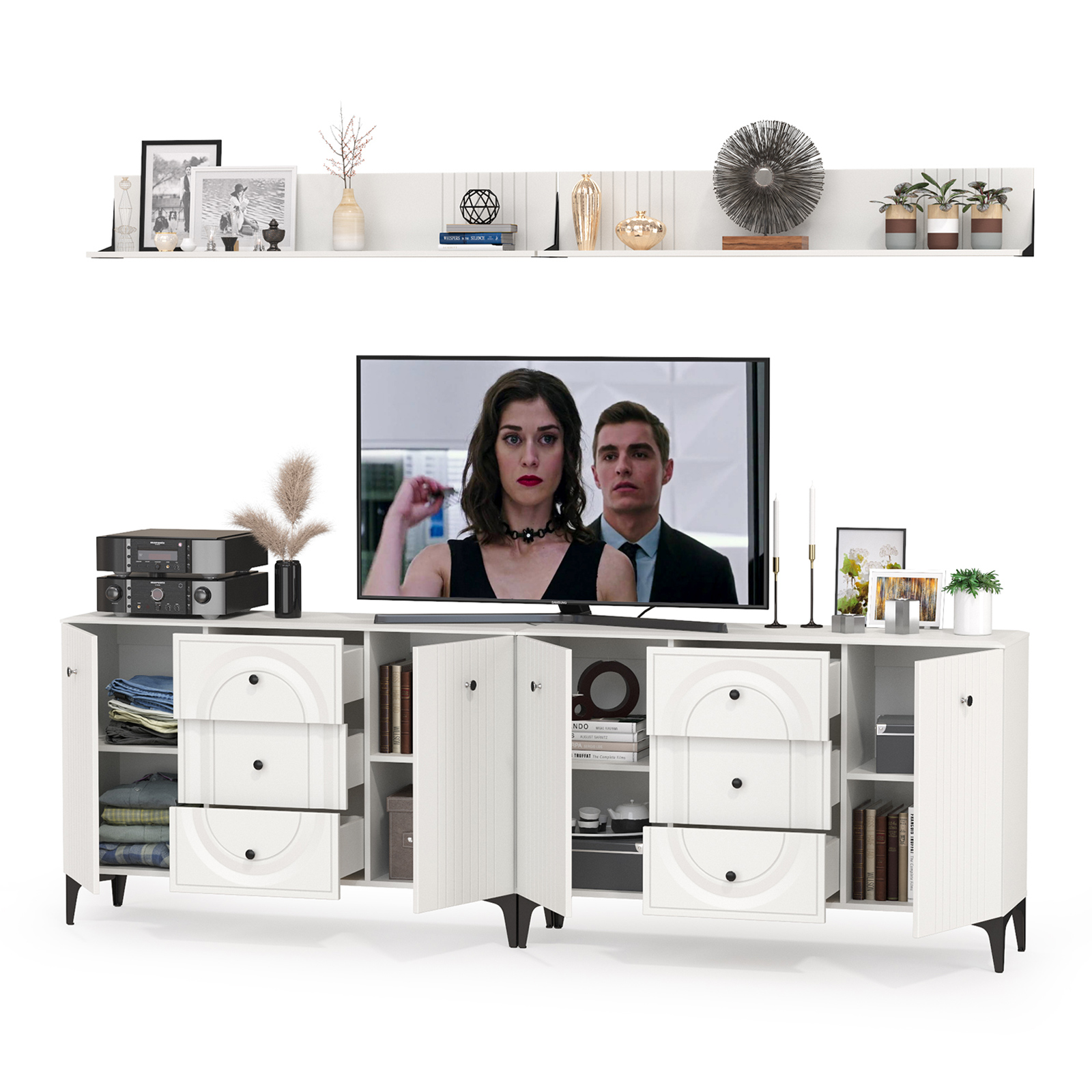 Два комода-ТВ-тумбы Валенсия № 90 с двумя навесными полками - стильный набор для светлой гостиной в популярном стиле ар-деко.