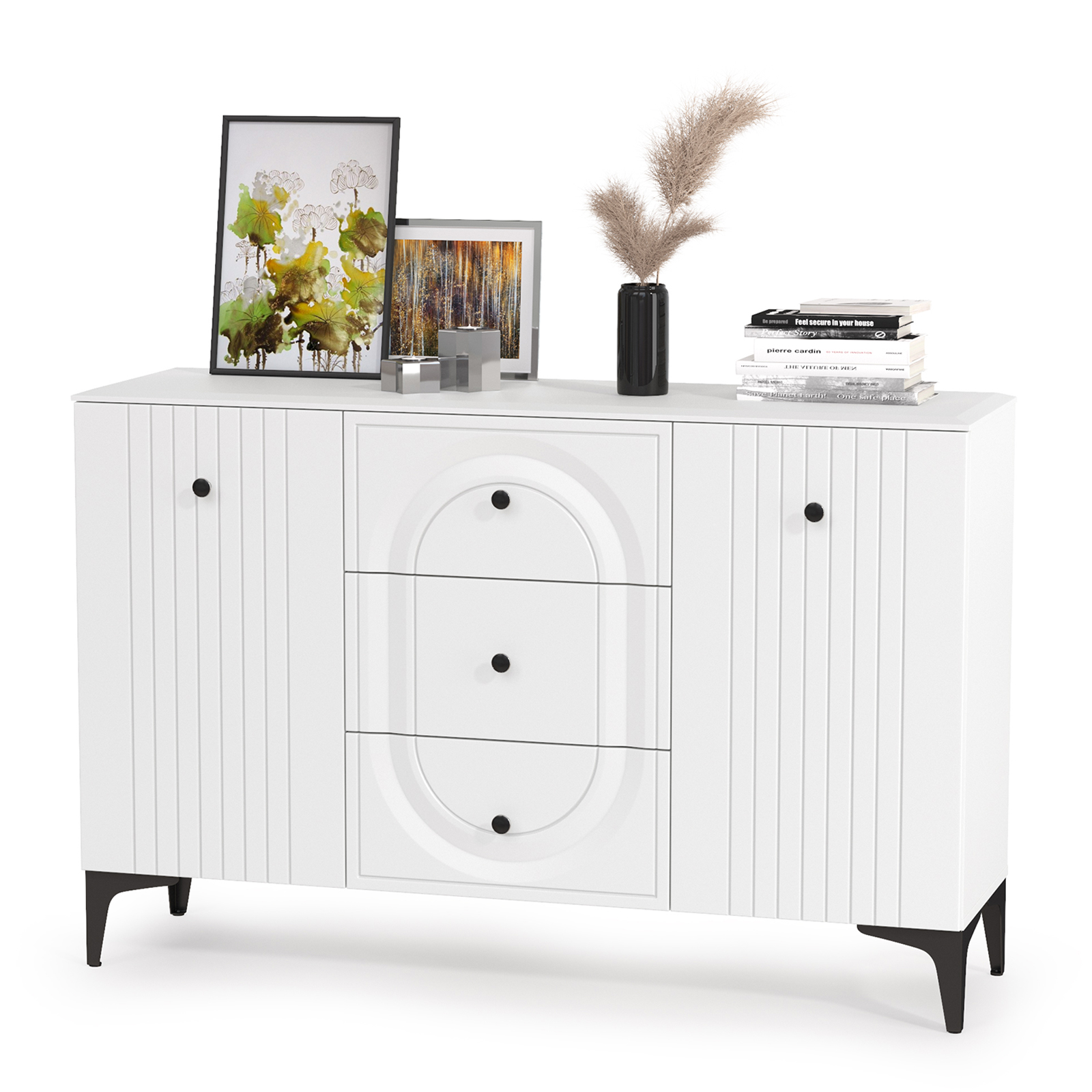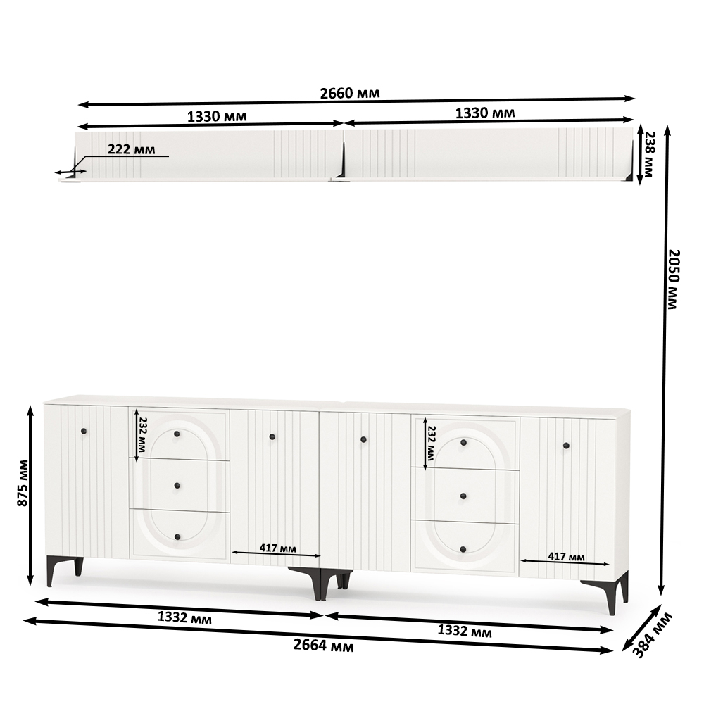Графичное и стильное сочетание белоснежных фасадов и черных деталей эффектно расставляет акценты на мебели. Геометрический рисунок фрезеровки на белоснежных фасадах даёт развитый светотеневой рисунок. Комплектация состоит из двух комодов Валенсия 13.309 и двух навесных полок Валенсия 16.481. Каждый комод с распашными дверками по бокам и тремя выдвижными ящиками в центре - вместительный и функциональный. Можно использовать как широкую ТВ-тумбу. Над комодами расположены две навесные открытые полки с задней панелью из МДФ. Полочка и задняя панель, каждой полки соединены металлическими кронштейнами черного цвета, усиливающие конструкцию и служащими креплениями к стене. Ящики установлены на направляющие скрытого монтажа с доводчиками. Двери закреплены на четырехшарнирных петлях. Установлена мебель на высокие ножки, что делает конструкцию лёгкой и воздушной и практичной в плане уборки. Мебель выполнена из экологически чистой ламинированной ДСП 16 мм, класса эмиссии Е1, детали обработаны ПВХ-кромкой. Фасады из МДФ с матовой ПВХ-плёнкой. Такое решение делает мебель визуально более ""мягкой"", комфортной и расслабляющей, что особенно актуально для спальни. Поставляется в разобранном виде в надёжной упаковке, с комплектом сборочной фурнитуры и инструкцией по сборке.
