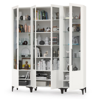 Графичное и стильное сочетание белоснежных фасадов и черных деталей эффектно расставляет акценты на мебели. Геометричный рисунок фрезеровки на белоснежных фасадах даёт развитый светотеневой рисунок. Комплектация состоит из двух пеналов Валенсия 13.218 и серванта Валенсия 13.217 объединеных в стенку-библиотеку. Двухдверный сервант Валенсия 13.217 оснащен стеклянными вставками в дверях. Можно использовать как книжный шкаф и как витрину для наград, фотографий, поделок или элементов декора. За распашными дверями серванта расположены 6 полок из ЛДСП. Каждый пенал украшен оригинальной стеклянной вставкой на фасаде, за которой расположены стеклянные полки. За дверкой каждого пенала расположены 6 полок - четыре верхние полочки выполнены из стекла, нижние две из ЛДСП. Универсальная сборка - сторону открывания двери Вы определяете при сборке. Двери закреплены на четырехшарнирных петлях. Установлена мебель на высокие ножки, что делает конструкцию лёгкой и воздушной и практичной в плане уборки. Мебель выполнена из экологически чистой ламинированной ДСП 16 мм, класса эмиссии Е1, детали обработаны ПВХ-кромкой. Фасады из МДФ с матовой ПВХ-плёнкой. Такое решение делает мебель визуально более ""мягкой"", комфортной и расслабляющей, что особенно актуально для спальни. Поставляется в разобранном виде в надёжной упаковке, с комплектом сборочной фурнитуры и инструкцией по сборке.