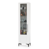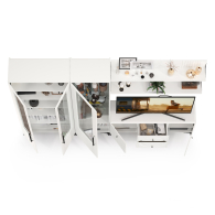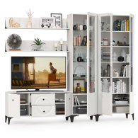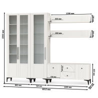 Графичное и стильное сочетание белоснежных фасадов и черных деталей эффектно расставляет акценты на мебели. Геометричный рисунок фрезеровки на белоснежных фасадах даёт развитый светотеневой рисунок. Комплектация состоит из ТВ-тумбы Валенсия 16.45, пенала Валенсия 13.218, серванта Валенсия 13.217 и двух навесных полок Валенсия 16.481. Тумба под ТВ Валенсия 16.45 оснащена двумя выдвижными ящиками по центру и нишами с полкой за распашными дверками по краям. Над тумбой расположены две навесные открытые полки с задней панелью из МДФ. Полочка и задняя панель, каждой соединены металлическими кронштейнами черного цвета, усиливающие конструкцию и служащими креплениями к стене. Двухдверный сервант Валенсия 13.217 оснащен стеклянными вставками в дверях. Можно использовать как книжный шкаф и как витрину для наград, фотографий, поделок или элементов декора. За распашными дверями серванта расположены 6 полок из ЛДСП. Пенал украшен оригинальной стеклянной вставкой на фасаде, за которой расположены стеклянные полки. За дверкой пенала расположены 6 полок - четыре верхние полочки выполнены из стекла, нижние две из ЛДСП. Универсальная сборка - сторону открывания двери Вы определяете при сборке. Ящики установлены на направляющие скрытого монтажа с доводчиками. Двери закреплены на четырехшарнирных петлях. Установлена мебель на высокие ножки, что делает конструкцию лёгкой и воздушной и практичной в плане уборки. Мебель выполнена из экологически чистой ламинированной ДСП 16 мм, класса эмиссии Е1, детали обработаны ПВХ-кромкой. Фасады из МДФ с матовой ПВХ-плёнкой. Такое решение делает мебель визуально более ""мягкой"", комфортной и расслабляющей, что особенно актуально для спальни. Поставляется в разобранном виде в надёжной упаковке, с комплектом сборочной фурнитуры и инструкцией по сборке.