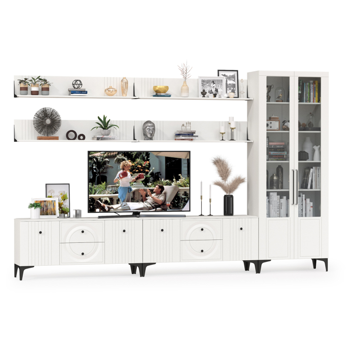 Сервант для гостиной Валенсия № 84 с двумя ТВ-тумбами и четыре полки - стильный набор для светлой гостиной в популярном стиле ар-деко.