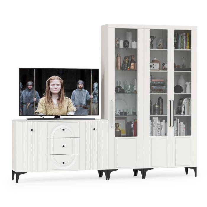 Графичное и стильное сочетание белоснежных фасадов и черных деталей эффектно расставляет акценты на мебели. Геометричный рисунок фрезеровки на белоснежных фасадах даёт развитый светотеневой рисунок. Комплектация состоит из комод-ТВ-тумбы Валенсия 13.309, пенала Валенсия 13.218 и серванта Валенсия 13.217. Широкий комод с распашными дверками по бокам и тремя выдвижными ящиками в центре - вместительный и функциональный. Можно использовать как ТВ-тумбу. Сервант и пенал объединены в стенку-библиотеку. Двухдверный сервант Валенсия 13.217 оснащен стеклянными вставками в дверях. Можно использовать как книжный шкаф и как витрину для наград, фотографий, поделок или элементов декора. За распашными дверями серванта расположены 6 полок из ЛДСП. Пенал украшен оригинальной стеклянной вставкой на фасаде, за которой расположены стеклянные полки. За дверкой пенала расположены 6 полок - четыре верхние полочки выполнены из стекла, нижние две из ЛДСП. Универсальная сборка - сторону открывания двери Вы определяете при сборке. Ящики установлены на направляющие скрытого монтажа с доводчиками. Двери закреплены на четырехшарнирных петлях. Установлена мебель на высокие ножки, что делает конструкцию лёгкой и воздушной и практичной в плане уборки. Мебель выполнена из экологически чистой ламинированной ДСП 16 мм, класса эмиссии Е1, детали обработаны ПВХ-кромкой. Фасады из МДФ с матовой ПВХ-плёнкой. Такое решение делает мебель визуально более ""мягкой"", комфортной и расслабляющей, что особенно актуально для спальни. Поставляется в разобранном виде в надёжной упаковке, с комплектом сборочной фурнитуры и инструкцией по сборке.