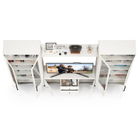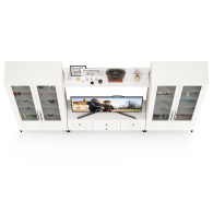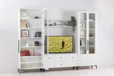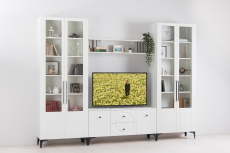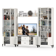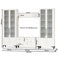 Графичное и стильное сочетание белоснежных фасадов и черных деталей эффектно расставляет акценты на мебели. Геометричный рисунок фрезеровки на белоснежных фасадах даёт развитый светотеневой рисунок. Комплектация состоит из ТВ-тумбы Валенсия 16.45, двух сервантов Валенсия 13.217 и навесной полки Валенсия 16.481. Тумба под ТВ Валенсия 16.45 оснащена двумя выдвижными ящиками по центру и нишами с полкой за распашными дверками по краям. Над тумбой расположена навесная открытая полка с задней панелью из МДФ. Полочка и задняя панель соединены металлическими кронштейнами черного цвета, усиливающие конструкцию и служащими креплениями к стене. Два серванта Валенсия 13.217 расположены по бокам образуя стенку для гостиной. Каждый двухдверный сервант оснащен стеклянными вставками в дверях. Можно использовать как книжный шкаф и как витрину для наград, фотографий, поделок или элементов декора. За распашными дверями каждого серванта расположены 6 полок из ЛДСП. Ящики установлены на направляющие скрытого монтажа с доводчиками. Двери закреплены на четырехшарнирных петлях. Установлена мебель на высокие ножки, что делает конструкцию лёгкой и воздушной и практичной в плане уборки. Мебель выполнена из экологически чистой ламинированной ДСП 16 мм, класса эмиссии Е1, детали обработаны ПВХ-кромкой. Фасады из МДФ с матовой ПВХ-плёнкой. Такое решение делает мебель визуально более ""мягкой"", комфортной и расслабляющей, что особенно актуально для спальни. Поставляется в разобранном виде в надёжной упаковке, с комплектом сборочной фурнитуры и инструкцией по сборке.