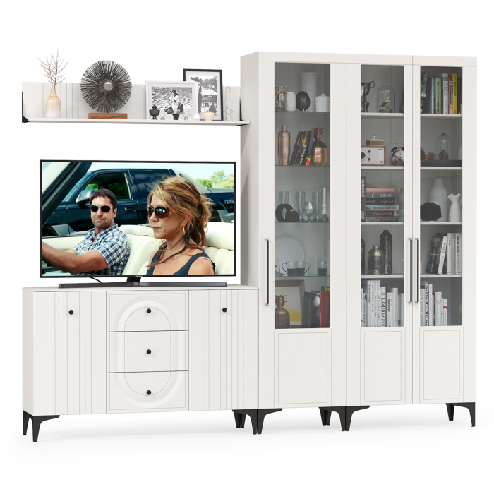 Графичное и стильное сочетание белоснежных фасадов и черных деталей эффектно расставляет акценты на мебели. Геометричный рисунок фрезеровки на белоснежных фасадах даёт развитый светотеневой рисунок. Комплектация состоит из комод-ТВ-тумбы Валенсия 13.309, пенала Валенсия 13.218, серванта Валенсия 13.217 и навесной полки Валенсия 16.481. Широкий комод с распашными дверками по бокам и тремя выдвижными ящиками в центре - вместительный и функциональный. Можно использовать как ТВ-тумбу. Над тумбой расположена навесная открытая полка с задней панелью из МДФ. Полочка и задняя панель соединены металлическими кронштейнами черного цвета, усиливающие конструкцию и служащими креплениями к стене. Сервант и пенал объединены в стенку-библиотеку. Двухдверный сервант Валенсия 13.217 оснащен стеклянными вставками в дверях. Можно использовать как книжный шкаф и как витрину для наград, фотографий, поделок или элементов декора. За распашными дверями серванта расположены 6 полок из ЛДСП. Пенал украшен оригинальной стеклянной вставкой на фасаде, за которой расположены стеклянные полки. За дверкой пенала расположены 6 полок - четыре верхние полочки выполнены из стекла, нижние две из ЛДСП. Универсальная сборка - сторону открывания двери Вы определяете при сборке. Ящики установлены на направляющие скрытого монтажа с доводчиками. Двери закреплены на четырехшарнирных петлях. Установлена мебель на высокие ножки, что делает конструкцию лёгкой и воздушной и практичной в плане уборки. Мебель выполнена из экологически чистой ламинированной ДСП 16 мм, класса эмиссии Е1, детали обработаны ПВХ-кромкой. Фасады из МДФ с матовой ПВХ-плёнкой. Такое решение делает мебель визуально более ""мягкой"", комфортной и расслабляющей, что особенно актуально для спальни. Поставляется в разобранном виде в надёжной упаковке, с комплектом сборочной фурнитуры и инструкцией по сборке.