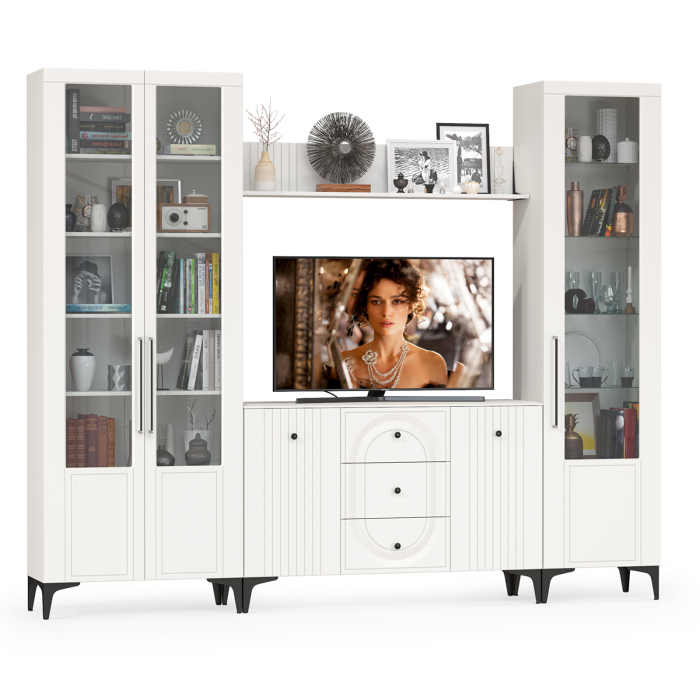 Графичное и стильное сочетание белоснежных фасадов и черных деталей эффектно расставляет акценты на мебели. Геометричный рисунок фрезеровки на белоснежных фасадах даёт развитый светотеневой рисунок. Комплектация состоит из комод-ТВ-тумбы Валенсия 13.309, пенала Валенсия 13.218, серванта Валенсия 13.217 и навесной полки Валенсия 16.481. Широкий комод с распашными дверками по бокам и тремя выдвижными ящиками в центре - вместительный и функциональный. Можно использовать как ТВ-тумбу. Над тумбой расположена навесная открытая полка с задней панелью из МДФ. Полочка и задняя панель соединены металлическими кронштейнами черного цвета, усиливающие конструкцию и служащими креплениями к стене. Сервант и пенал расположены по краям и образуют стенку для гостиной. Двухдверный сервант Валенсия 13.217 оснащен стеклянными вставками в дверях. Можно использовать как книжный шкаф и как витрину для наград, фотографий, поделок или элементов декора. За распашными дверями серванта расположены 6 полок из ЛДСП. Пенал украшен оригинальной стеклянной вставкой на фасаде, за которой расположены стеклянные полки. За дверкой пенала расположены 6 полок - четыре верхние полочки выполнены из стекла, нижние две из ЛДСП. Универсальная сборка - сторону открывания двери Вы определяете при сборке. Ящики установлены на направляющие скрытого монтажа с доводчиками. Двери закреплены на четырехшарнирных петлях. Установлена мебель на высокие ножки, что делает конструкцию лёгкой и воздушной и практичной в плане уборки. Мебель выполнена из экологически чистой ламинированной ДСП 16 мм, класса эмиссии Е1, детали обработаны ПВХ-кромкой. Фасады из МДФ с матовой ПВХ-плёнкой. Такое решение делает мебель визуально более ""мягкой"", комфортной и расслабляющей, что особенно актуально для спальни. Поставляется в разобранном виде в надёжной упаковке, с комплектом сборочной фурнитуры и инструкцией по сборке.
