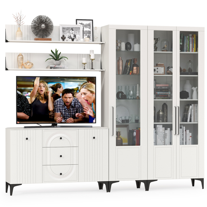 Графичное и стильное сочетание белоснежных фасадов и черных деталей эффектно расставляет акценты на мебели. Геометричный рисунок фрезеровки на белоснежных фасадах даёт развитый светотеневой рисунок. Комплектация состоит из комод-ТВ-тумбы Валенсия 13.309, пенала Валенсия 13.218, серванта Валенсия 13.217 и двух навесных полок Валенсия 16.481. Широкий комод с распашными дверками по бокам и тремя выдвижными ящиками в центре - вместительный и функциональный. Можно использовать как ТВ-тумбу. Над тумбой расположены две навесные открытые полки с задней панелью из МДФ. Полочка и задняя панель, каждой соединены металлическими кронштейнами черного цвета, усиливающие конструкцию и служащими креплениями к стене. Сервант и пенал объединены в стенку-библиотеку. Двухдверный сервант Валенсия 13.217 оснащен стеклянными вставками в дверях. Можно использовать как книжный шкаф и как витрину для наград, фотографий, поделок или элементов декора. За распашными дверями серванта расположены 6 полок из ЛДСП. Пенал украшен оригинальной стеклянной вставкой на фасаде, за которой расположены стеклянные полки. За дверкой пенала расположены 6 полок - четыре верхние полочки выполнены из стекла, нижние две из ЛДСП. Универсальная сборка - сторону открывания двери Вы определяете при сборке. Ящики установлены на направляющие скрытого монтажа с доводчиками. Двери закреплены на четырехшарнирных петлях. Установлена мебель на высокие ножки, что делает конструкцию лёгкой и воздушной и практичной в плане уборки. Мебель выполнена из экологически чистой ламинированной ДСП 16 мм, класса эмиссии Е1, детали обработаны ПВХ-кромкой. Фасады из МДФ с матовой ПВХ-плёнкой. Такое решение делает мебель визуально более ""мягкой"", комфортной и расслабляющей, что особенно актуально для спальни. Поставляется в разобранном виде в надёжной упаковке, с комплектом сборочной фурнитуры и инструкцией по сборке.