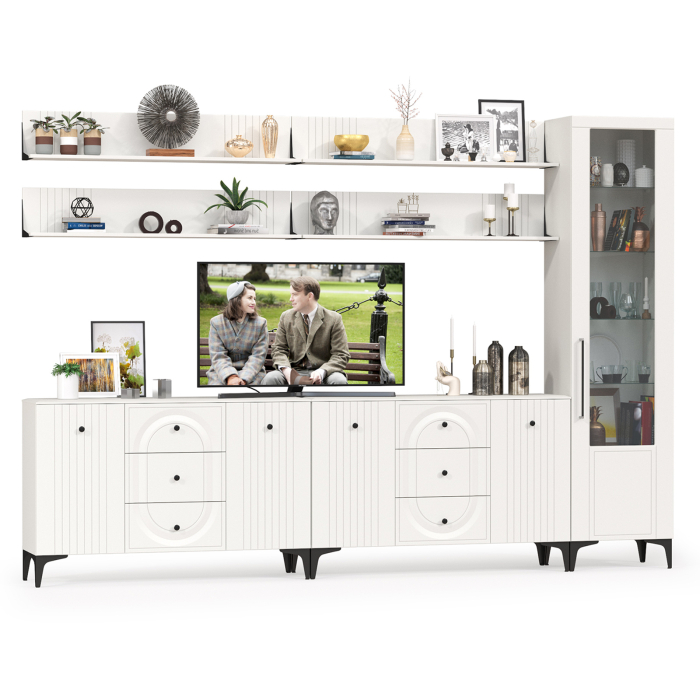 Графичное и стильное сочетание белоснежных фасадов и черных деталей эффектно расставляет акценты на мебели. Геометричный рисунок фрезеровки на белоснежных фасадах даёт развитый светотеневой рисунок. Комплектация состоит из двух комод-ТВ-тумб Валенсия 13.309, пенала Валенсия 13.218 и четырех навесных полок Валенсия 16.481. Конструктивно два комода Валенсия 13.309 объединены в единый блок и образуют широкую и вместительную ТВ-тумбу. Каждый комод с распашными дверками по бокам и тремя выдвижными ящиками в центре - вместительный и функциональный. Можно использовать как широкую ТВ-тумбу. Над тумбой расположены четыре навесные открытые полки с задней панелью из МДФ. Полочка и задняя панель, каждой соединены металлическими кронштейнами черного цвета, усиливающие конструкцию и служащими креплениями к стене. Пенал украшен оригинальной стеклянной вставкой на фасаде, за которой расположены стеклянные полки. За дверкой пенала расположены 6 полок - четыре верхние полочки выполнены из стекла, нижние две из ЛДСП. Универсальная сборка - сторону открывания двери Вы определяете при сборке. Ящики установлены на направляющие скрытого монтажа с доводчиками. Двери закреплены на четырехшарнирных петлях. Установлена мебель на высокие ножки, что делает конструкцию лёгкой и воздушной и практичной в плане уборки. Мебель выполнена из экологически чистой ламинированной ДСП 16 мм, класса эмиссии Е1, детали обработаны ПВХ-кромкой. Фасады из МДФ с матовой ПВХ-плёнкой. Такое решение делает мебель визуально более ""мягкой"", комфортной и расслабляющей, что особенно актуально для спальни. Поставляется в разобранном виде в надёжной упаковке, с комплектом сборочной фурнитуры и инструкцией по сборке.