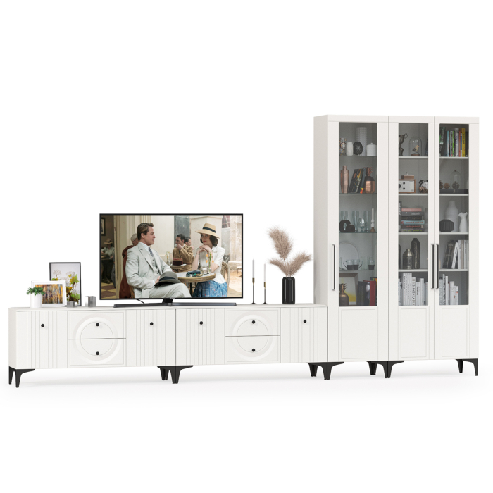 Графичное и стильное сочетание белоснежных фасадов и черных деталей эффектно расставляет акценты на мебели. Геометричный рисунок фрезеровки на белоснежных фасадах даёт развитый светотеневой рисунок. Комплектация состоит из двух ТВ-тумб Валенсия 16.45, пенала Валенсия 13.218 и серванта Валенсия 13.217. Широкая ТВ-тумба, конструктивно состоит из двух Валенсия 16.45 объединеных в единый блок. Тумба под ТВ Валенсия 16.45 (в комплектации 2 единицы) оснащена двумя выдвижными ящиками по центру и нишами с полкой за распашными дверками по краям. Сервант и пенал объединены в единый блок, образующий стенку-библиотеку. Двухдверный сервант Валенсия 13.217 оснащен стеклянными вставками в дверях. Можно использовать как книжный шкаф и как витрину для наград, фотографий, поделок или элементов декора. За распашными дверями серванта расположены 6 полок из ЛДСП. Пенал украшен оригинальной стеклянной вставкой на фасаде, за которой расположены стеклянные полки. За дверкой пенала расположены 6 полок - четыре верхние полочки выполнены из стекла, нижние две из ЛДСП. Универсальная сборка - сторону открывания двери Вы определяете при сборке. Ящики установлены на направляющие скрытого монтажа с доводчиками. Двери закреплены на четырехшарнирных петлях. Установлена мебель на высокие ножки, что делает конструкцию лёгкой и воздушной и практичной в плане уборки. Мебель выполнена из экологически чистой ламинированной ДСП 16 мм, класса эмиссии Е1, детали обработаны ПВХ-кромкой. Фасады из МДФ с матовой ПВХ-плёнкой. Такое решение делает мебель визуально более ""мягкой"", комфортной и расслабляющей, что особенно актуально для спальни. Поставляется в разобранном виде в надёжной упаковке, с комплектом сборочной фурнитуры и инструкцией по сборке.