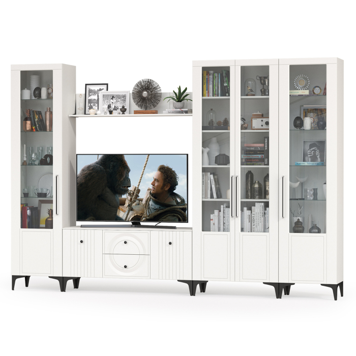 Графичное и стильное сочетание белоснежных фасадов и черных деталей эффектно расставляет акценты на мебели. Геометричный рисунок фрезеровки на белоснежных фасадах даёт развитый светотеневой рисунок. Комплектация состоит из ТВ-тумбы Валенсия 16.45, двух пеналов Валенсия 13.218, серванта Валенсия 13.217 и навесной полки Валенсия 16.481. Тумба под ТВ Валенсия 16.45 оснащена двумя выдвижными ящиками по центру и нишами с полкой за распашными дверками по краям. Над тумбой расположена навесная открытая полка с задней панелью из МДФ. Полочка и задняя панель соединены металлическими кронштейнами черного цвета, усиливающие конструкцию и служащими креплениями к стене. С одной стороны расположен сервант и пенал объединеные в единый болок, с другой пенал завершает комплектацию, образуя солидную стеночку для гостиной. Двухдверный сервант Валенсия 13.217 оснащен стеклянными вставками в дверях. Можно использовать как книжный шкаф и как витрину для наград, фотографий, поделок или элементов декора. За распашными дверями серванта расположены 6 полок из ЛДСП. Каждый пенал (в комплектации 2 пенала) украшен оригинальной стеклянной вставкой на фасаде, за которой расположены стеклянные полки. За дверкой каждого пенала расположены 6 полок - четыре верхние полочки выполнены из стекла, нижние две из ЛДСП. Универсальная сборка - сторону открывания двери Вы определяете при сборке. Ящики установлены на направляющие скрытого монтажа с доводчиками. Двери закреплены на четырехшарнирных петлях. Установлена мебель на высокие ножки, что делает конструкцию лёгкой и воздушной и практичной в плане уборки. Мебель выполнена из экологически чистой ламинированной ДСП 16 мм, класса эмиссии Е1, детали обработаны ПВХ-кромкой. Фасады из МДФ с матовой ПВХ-плёнкой. Такое решение делает мебель визуально более ""мягкой"", комфортной и расслабляющей, что особенно актуально для спальни. Поставляется в разобранном виде в надёжной упаковке, с комплектом сборочной фурнитуры и инструкцией по сборке.