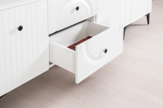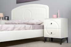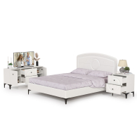Графичное и стильное сочетание белоснежных фасадов и черных деталей эффектно расставляет акценты на мебели. Геометричный рисунок фрезеровки на белоснежных фасадах даёт развитый светотеневой рисунок. Комплектация состоит из двуспальной кровати Валенсия 11.36.01, прикроватной тумбы Валенсия 13.291 и ТВ-тумбы Валенсия 16.45. Выбирая двуспальную кровать Валенсия 11.36.01 со спальным местом 1600х2000 мм, Вы выбираете крепкий сон и уют. Ортопедическое основание 1600х2000 мм. с гнутоклееными ламелями входит в комплект, матрас приобретаются отдельно. Углубление под матрас - 100 мм. Рекомендованная высота матраса от 100 до 220 мм. Максимально допустимая нагрузка на 1 спальное место - 100 кг. Тумба прикроватная Валенсия 13.291 оборудована двумя удобными выдвижными ящикам. Тумба под ТВ Валенсия 16.45 оснащена двумя выдвижными ящиками по центру и нишами с полкой за распашными дверками по краям. Ящики установлены на направляющие скрытого монтажа с доводчиками. Двери закреплены на четырехшарнирных петлях. Мебель установлена на высокие ножки, что делает конструкцию лёгкой и воздушной и практичной в плане уборки. Мебель выполнена из экологически чистой ламинированной ДСП 16 мм, класса эмиссии Е1, детали обработаны ПВХ-кромкой. Фасады из МДФ с матовой ПВХ-плёнкой. Такое решение делает мебель визуально более "мягкой", комфортной и расслабляющей, что особенно актуально для спальни.