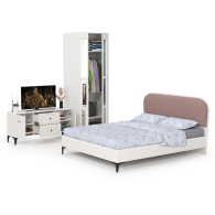 Гарнитур спальный с ТВ-тумбой и шкафом и кроватью с мягкой спинкой Валенсия № 42 - стильный набор для светлой гостиной в популярном стиле ар-деко.