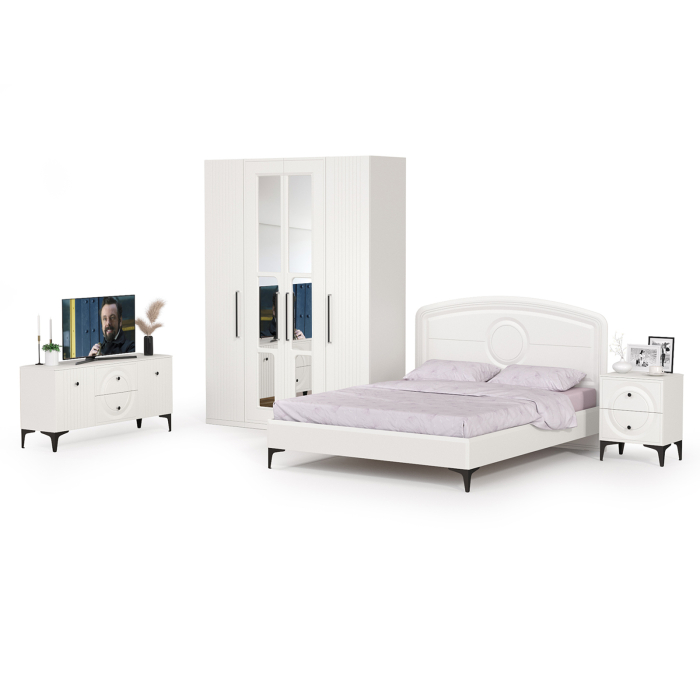 Графичное и стильное сочетание белоснежных фасадов и черных деталей эффектно расставляет акценты на мебели. Геометричный рисунок фрезеровки на белоснежных фасадах даёт развитый светотеневой рисунок. Комплектация состоит из двуспальной кровати Валенсия 11.36.01, прикроватной тумбы Валенсия 13.291, шкафа для одежды Валенсия 13.291, двух пеналов Валенсия 13.207 и ТВ-тумбы Валенсия 16.45. Выбирая двуспальную кровать Валенсия 11.36.01 со спальным местом 1600х2000 мм, Вы выбираете крепкий сон и уют. Ортопедическое основание 1600х2000 мм. с гнутоклееными ламелями входит в комплект, матрас приобретаются отдельно. Углубление под матрас - 100 мм. Рекомендованная высота матраса от 100 до 220 мм. Максимально допустимая нагрузка на 1 спальное место - 100 кг. Тумба прикроватная Валенсия 13.291 оборудована двумя удобными выдвижными ящикам. Тумба под ТВ Валенсия 16.45 оснащена двумя выдвижными ящиками по центру и нишами с полкой за распашными дверками по краям. Гардеробная композиция составлена из двух шкафов-пеналов расположенных по бокам и двухдверным шкафом по центру. 2-х дверный шкаф оборудован за распашными дверями штангой для одежды на плечиках и антресольной и нижней полками. Декор шкафа для одежды 2-х дверного решён нестандартно и интересно. Зеркало накладывается изнутри фасада, проявляя таким образом сквозную ажурную фрезеровку. Внутреннее наполнение пенала (в комплекте 2 единицы)Вы определяете сами, есть возможность расположить внутри - 5 полочек или штангу для одежлы на плечиках и две полки верхнюю и нижнюю. Пять полок внутри шкафа-пенала позволят обустроить библиотеку, а штанга для одежды с 2-мя полками - мини-гардеробную. Ящики установлены на направляющие скрытого монтажа с доводчиками. Двери закреплены на четырехшарнирных петлях. Установлена мебель на высокие ножки, что делает конструкцию лёгкой и воздушной и практичной в плане уборки. Мебель выполнена из экологически чистой ламинированной ДСП 16 мм, класса эмиссии Е1, детали обработаны ПВХ-кромкой. Фасады из МДФ с матовой ПВХ-плёнкой. Такое решение делает мебель визуально более "мягкой", комфортной и расслабляющей, что особенно актуально для спальни.