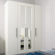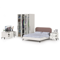 Графичное и стильное сочетание белоснежных фасадов и черных деталей эффектно расставляет акценты на мебели. Геометричный рисунок фрезеровки на белоснежных фасадах даёт развитый светотеневой рисунок. Спальня состоит из двуспальной кровати с мягкой спинкой Валенсия 11.36.02, прикроватной тумбы Валенсия 13.291, шкафа для одежды Валенсия 13.291, двух пеналов Валенсия 13.207 и ТВ-тумбы Валенсия 16.45. Выбирая двуспальную кровать Валенсия 11.36.02 с мякгой спинкой со спальным местом 1600х2000 мм, Вы выбираете крепкий сон и уют. Декоративное изголовье кровати выполнен с мягким элементом. Обивка кровати Валенсия 11.36.02 выполнена из модной, удобной в эксплуатации ткани Велутто. Ортопедическое основание 1600х2000 мм. с гнутоклееными ламелями входит в комплект, матрас приобретаются отдельно. Углубление под матрас - 100 мм. Рекомендованная высота матраса от 100 до 220 мм. Максимально допустимая нагрузка на 1 спальное место - 100 кг. Тумба прикроватная Валенсия 13.291 оборудована двумя удобными выдвижными ящикам. Тумба под ТВ Валенсия 16.45 оснащена двумя выдвижными ящиками по центру и нишами с полкой за распашными дверками по краям. Гардеробная композиция составлена из двух шкафов-пеналов расположенных по бокам и двухдверным шкафом по центру. 2-х дверный шкаф оборудован за распашными дверями штангой для одежды на плечиках и антресольной и нижней полками. Декор шкафа для одежды 2-х дверного решён нестандартно и интересно. Зеркало накладывается изнутри фасада, проявляя таким образом сквозную ажурную фрезеровку. Внутреннее наполнение пенала (в комплекте 2 единицы)Вы определяете сами, есть возможность расположить внутри - 5 полочек или штангу для одежлы на плечиках и две полки верхнюю и нижнюю. Пять полок внутри шкафа-пенала позволят обустроить библиотеку, а штанга для одежды с 2-мя полками - мини-гардеробную. Ящики установлены на направляющие скрытого монтажа с доводчиками. Двери закреплены на четырехшарнирных петлях. Установлена мебель на высокие ножки, что делает конструкцию лёгкой и воздушной и практичной в плане уборки. Мебель выполнена из экологически чистой ламинированной ДСП 16 мм, класса эмиссии Е1, детали обработаны ПВХ-кромкой. Фасады из МДФ с матовой ПВХ-плёнкой. Такое решение делает мебель визуально более "мягкой", комфортной и расслабляющей, что особенно актуально для спальни.