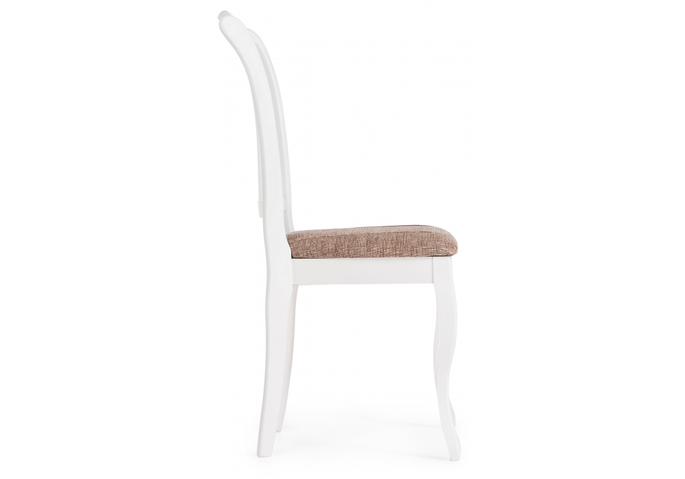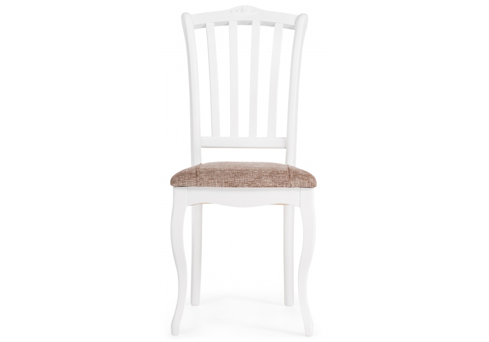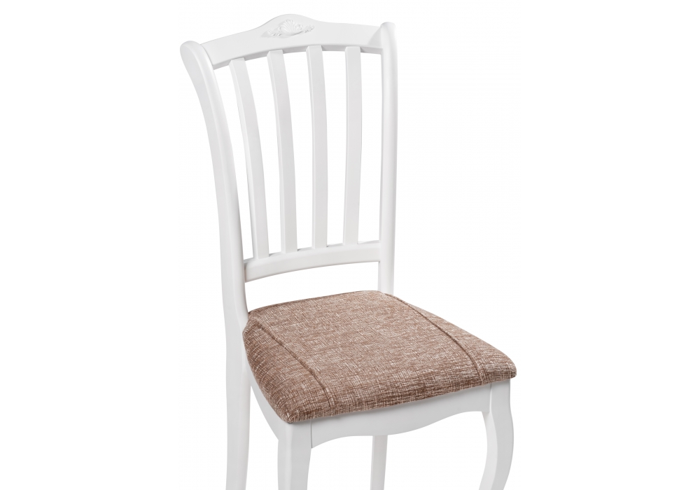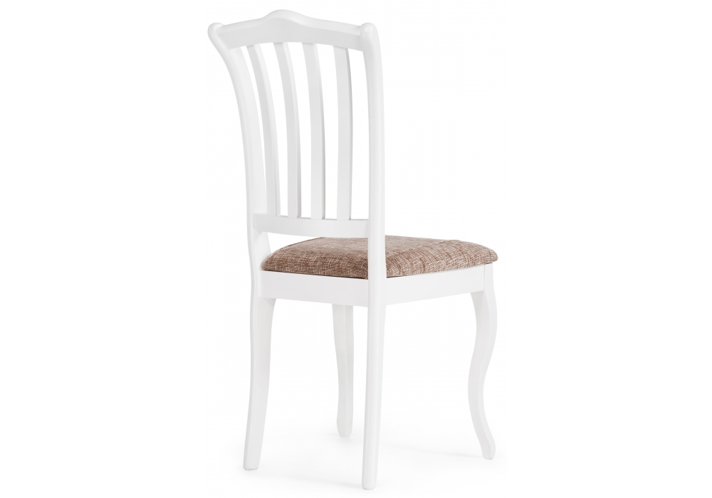 Материал каркаса - Массив березы; Материал сиденья - Ткань; Материал ножек - Массив березы; Материал обивки - Ткань; Цвет каркаса - Белый; Цвет сиденья - Коричневый; Цвет ножек - Белый; Цвет обивки - Коричневый; Ширина - 43; Глубина - 55; Высота - 97; Ширина сиденья - 40; Глубина сиденья - 42; Высота сиденья - 46.