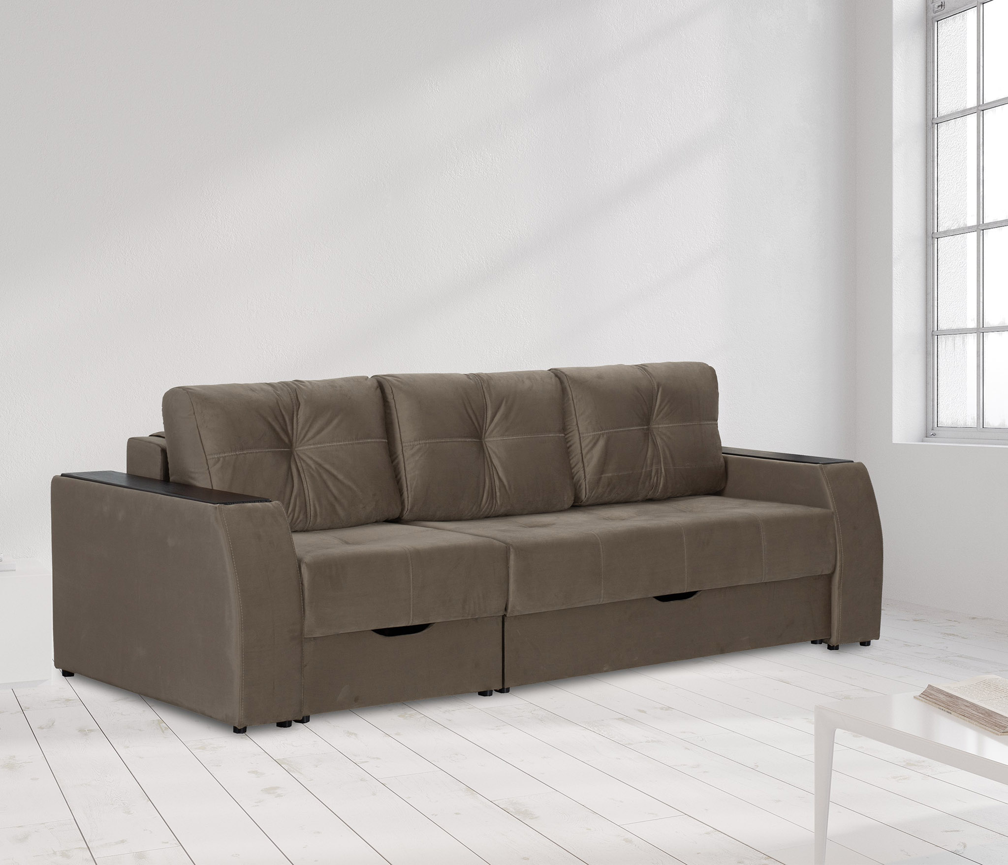 С таким диваном пространство не перегружено. Если мебель установить в угол комнаты, останется много свободного места - отличный способ рационально использовать жилое пространство.