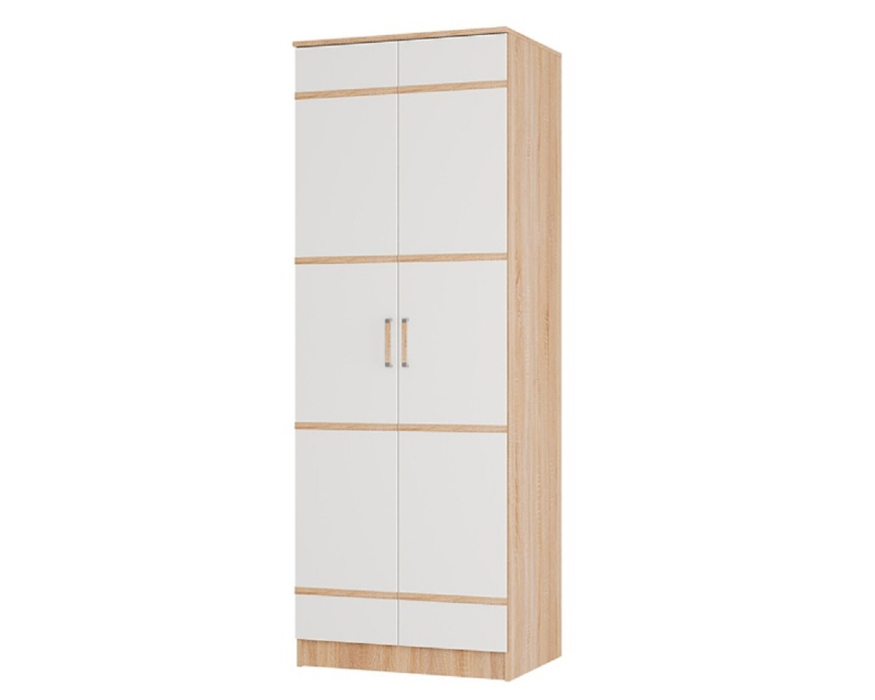 Двухдверный распашной шкаф Сакура - практичное решение в том случае, если Вам необходимо организовать хранение в малогабаритной спальне или прихожей. Корпус выполнен в декоре "дуб сонома", фасады - в белом с геометрическими древесными вставками. Наполнение шкафа представлено комплектом полок и продольной штангой, которые Вы можете установить на удобной для Вас высоте. Благодаря этому места хватит для одежды на плечиках, вещей в сложенном виде, обуви и т.д.