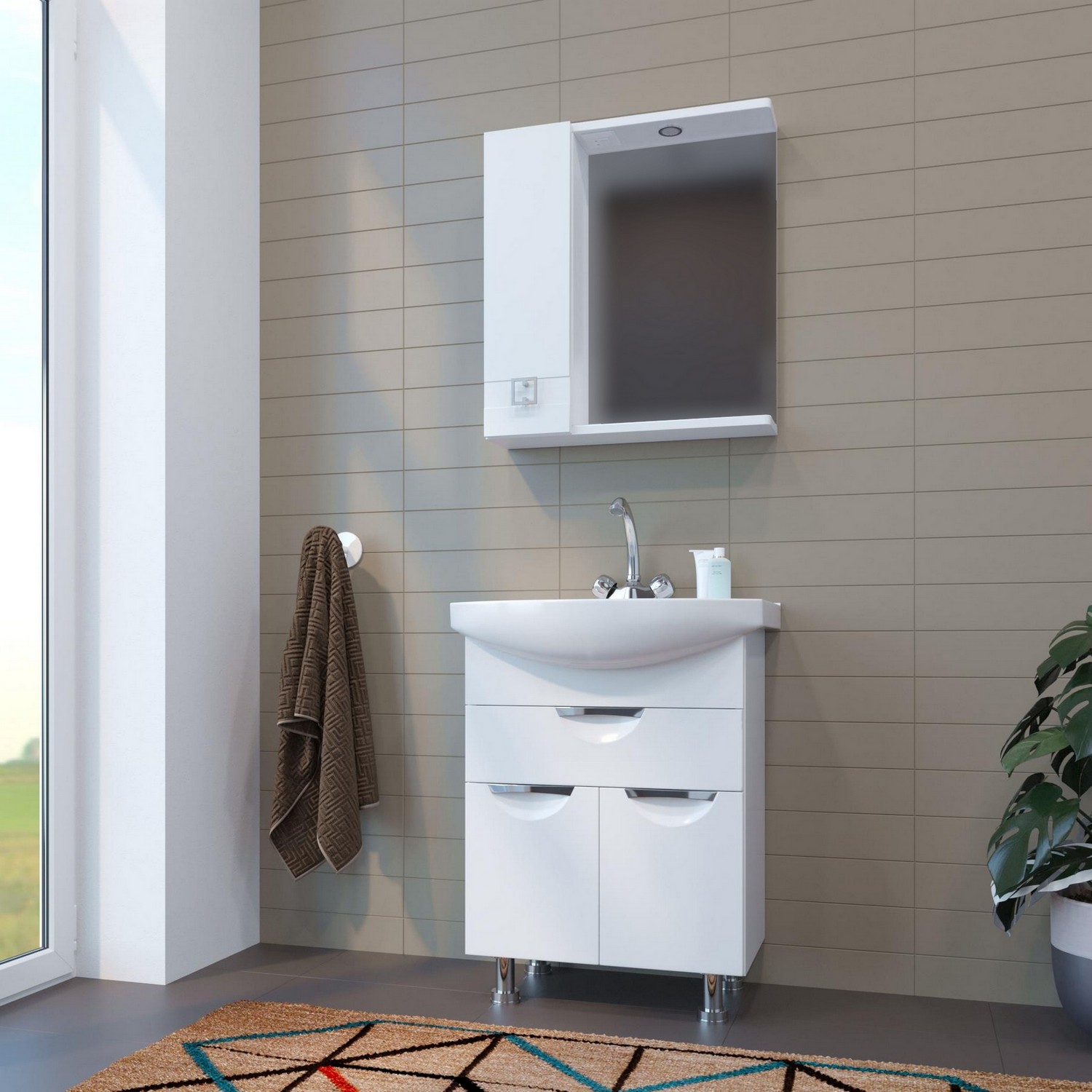 Коллекция КВАДРО создана специально для любителей классического дизайна. Правильные геометрические формы тумбы и шкафчика зрительно вытянут пространство ванной комнаты, а оригинальная современная фурнитура на мебели освежит весь интерьер помещения.
