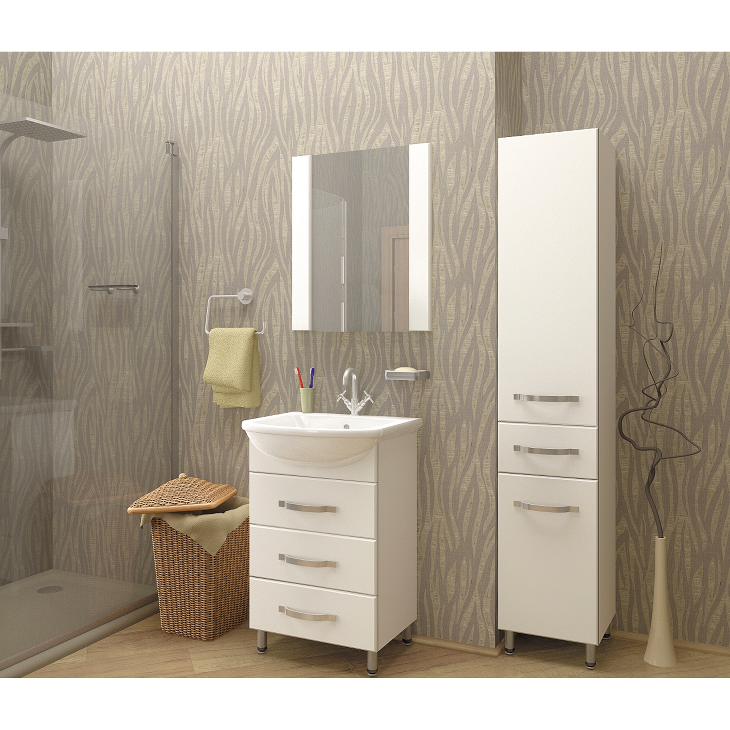 Ослепительно белый цвет, строгие грани фасадов, холодный блеск ручек делают этот комплект похожим на драгоценный камень. Этот мебельный ансамбль украсит любую ванную комнату.