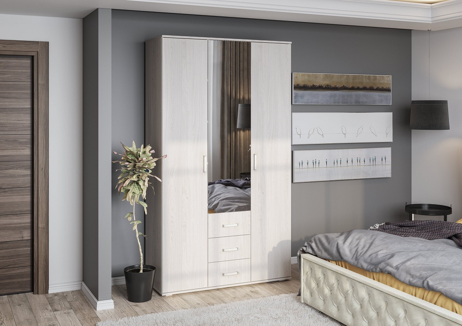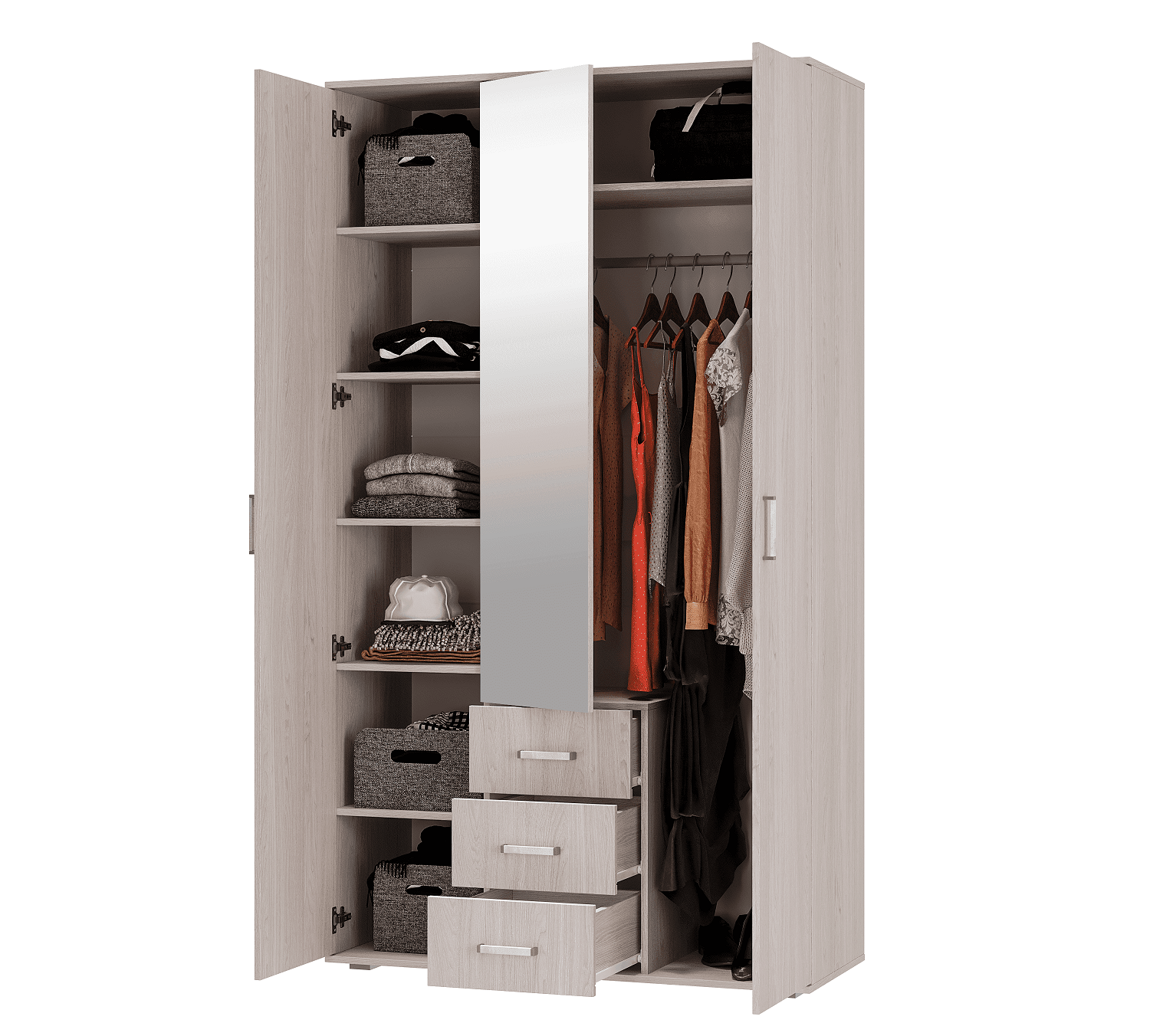 Трехдверный шкафиз коллекции мебели Белла отличается продуманным разноплановым наполнением. Комплектация модуля включает стационарную штангу, комплект полок и 3 выкатных ящика на роликовых направляющих. Всей Вашей одежде на плечиках, в сложенном виде, а также аксессуарам и текстилю хватит места. Шкаф выполнен в приятном декоре "ясень белый" с имитацией текстуры дерева. Зеркало на центральном фасаде визуально облегчает конструкцию шкафа и освежает окружающую обстановку.