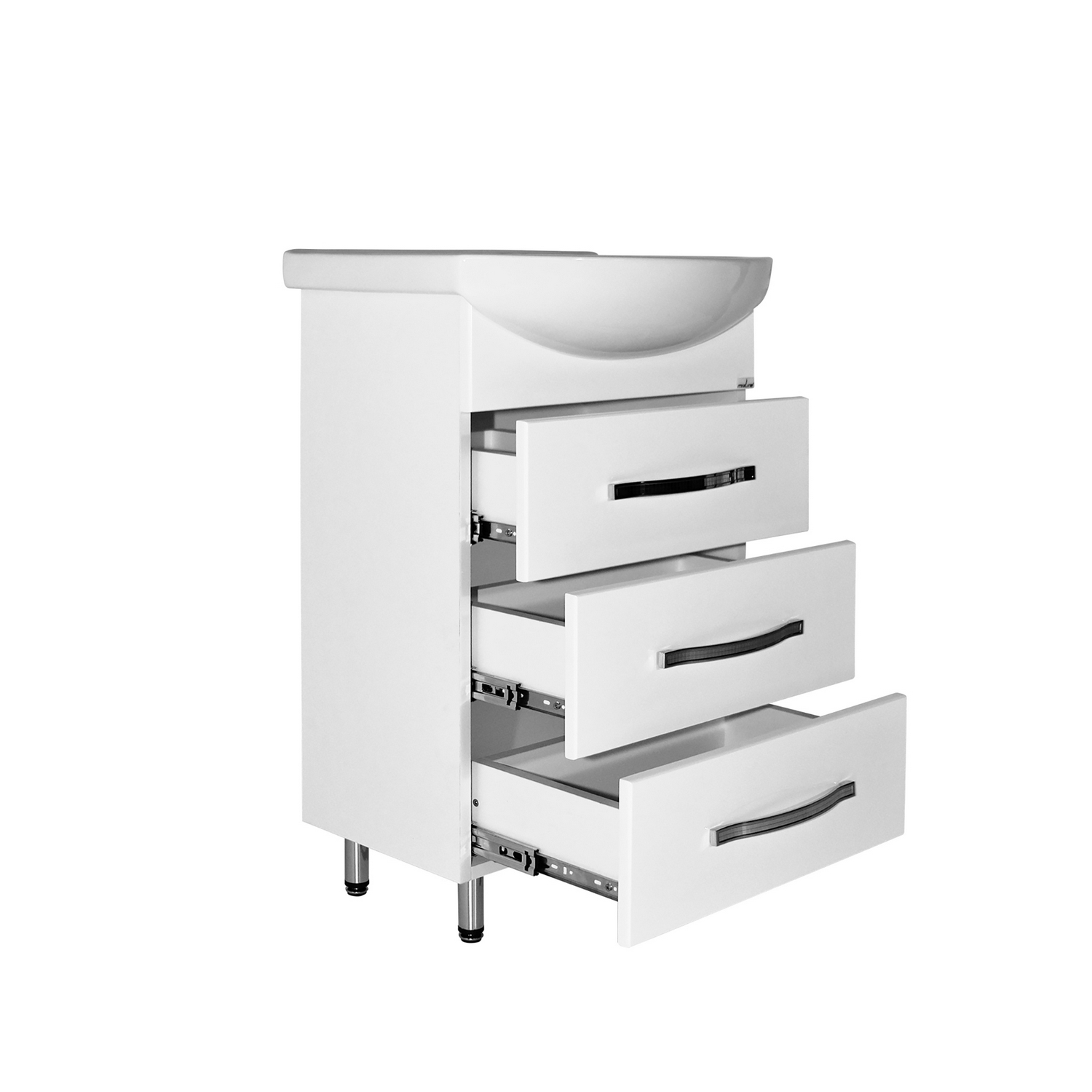 Ослепительно белый цвет, строгие грани фасадов, холодный блеск ручек делают этот комплект похожим на драгоценный камень. Этот мебельный ансамбль украсит любую ванную комнату.