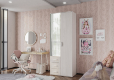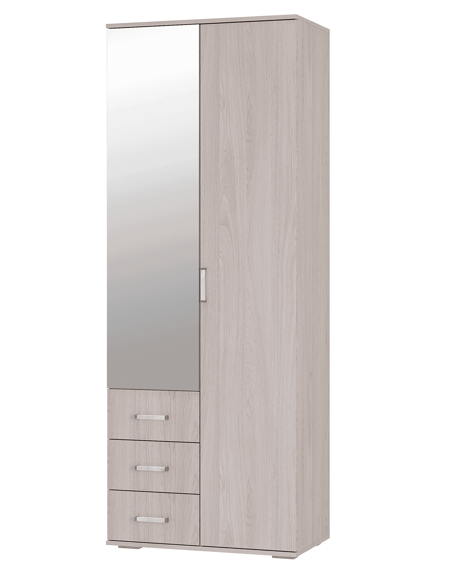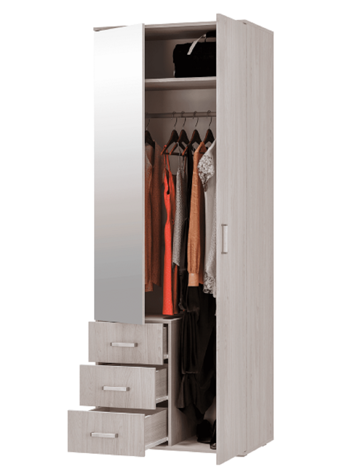 Двухдверный шкафиз коллекции мебели Белла отличается небольшим размером и увеличенной вместимостью. Комплектация модуля включает стационарную штангу, вместительную полку и 3 выкатных ящика на роликовых направляющих. Всей Вашей одежде на плечиках, в сложенном виде, а также аксессуарам и текстилю хватит места. Шкаф выполнен в приятном декоре "ясень белый" с имитацией текстуры дерева. Зеркало на одном из фасадов визуально облегчает конструкцию шкафа и освежает окружающую обстановку.
