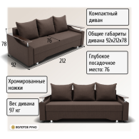 Достоинства: ровное спальное место, лёгкость процесса трансформации дивана, ёмкий бельевой ящик, прочность механизма, долговечность конструкции.