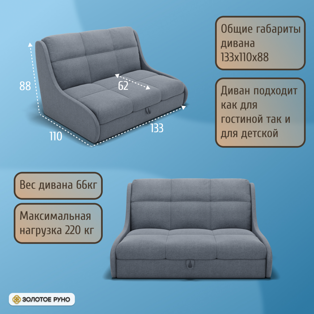 Компактный и современный диван. Отлично подойдет для детской комнаты и небольшой квартиры.