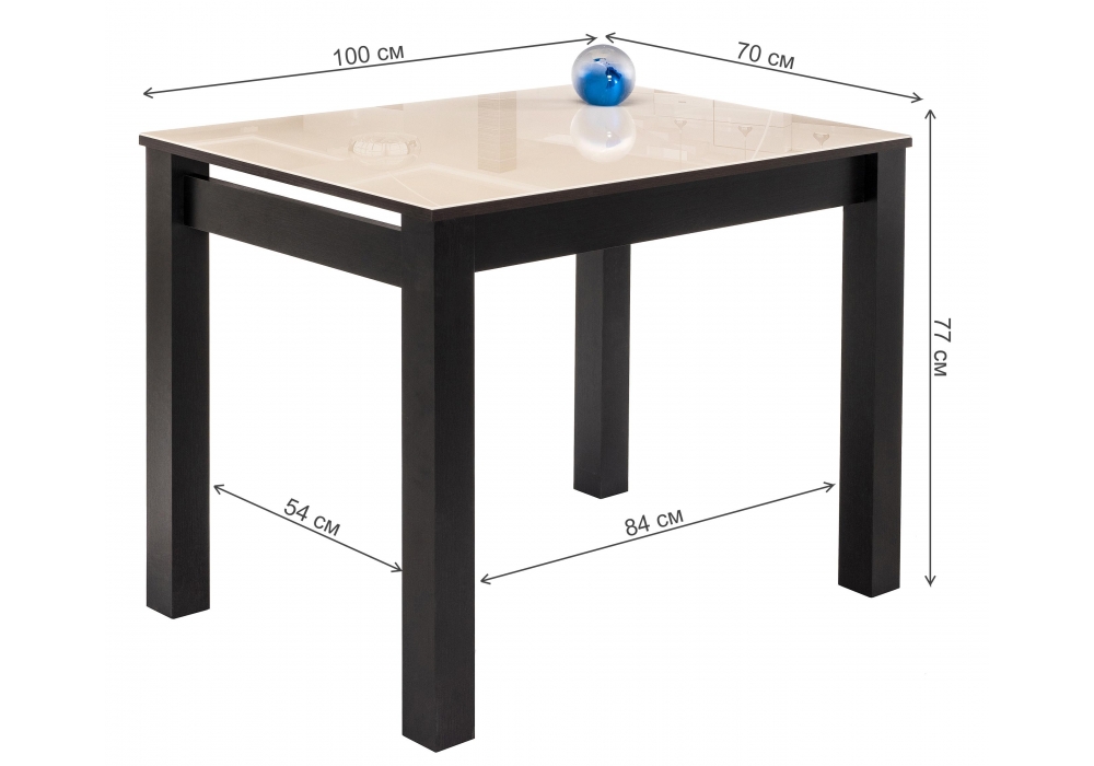 Толщина столешницы: 20 мм. Материал каркаса - МДФ; Материал ножек - МДФ; Материал столешницы - Стекло; Цвет каркаса - Венге; Цвет ножек - Венге; Ширина - 70; Высота - 77; Длина - 100.