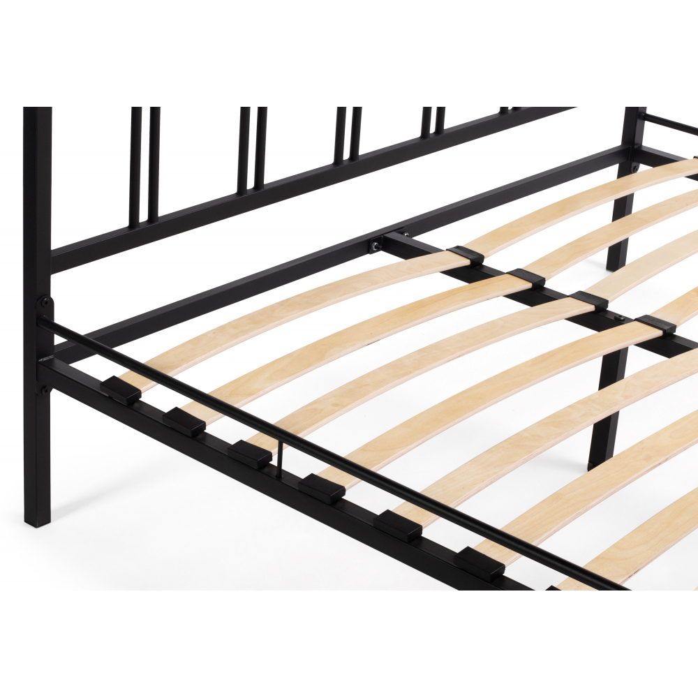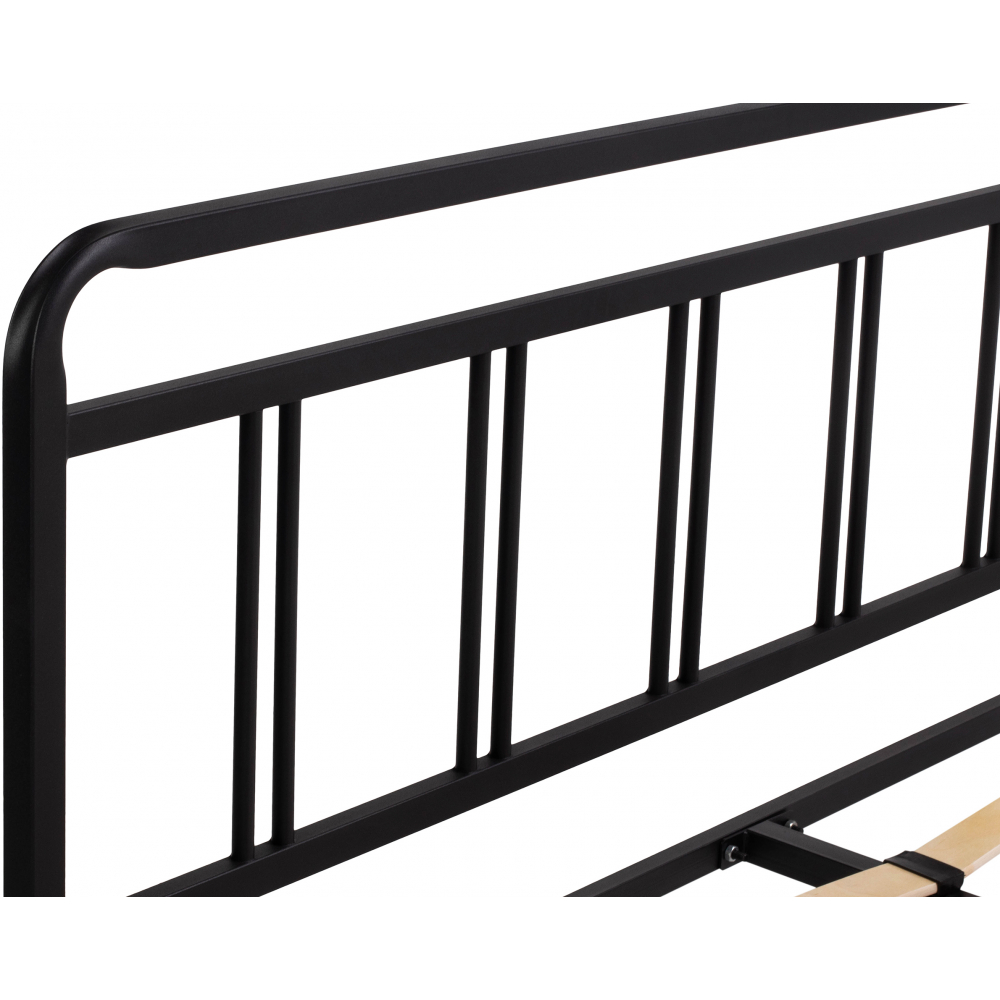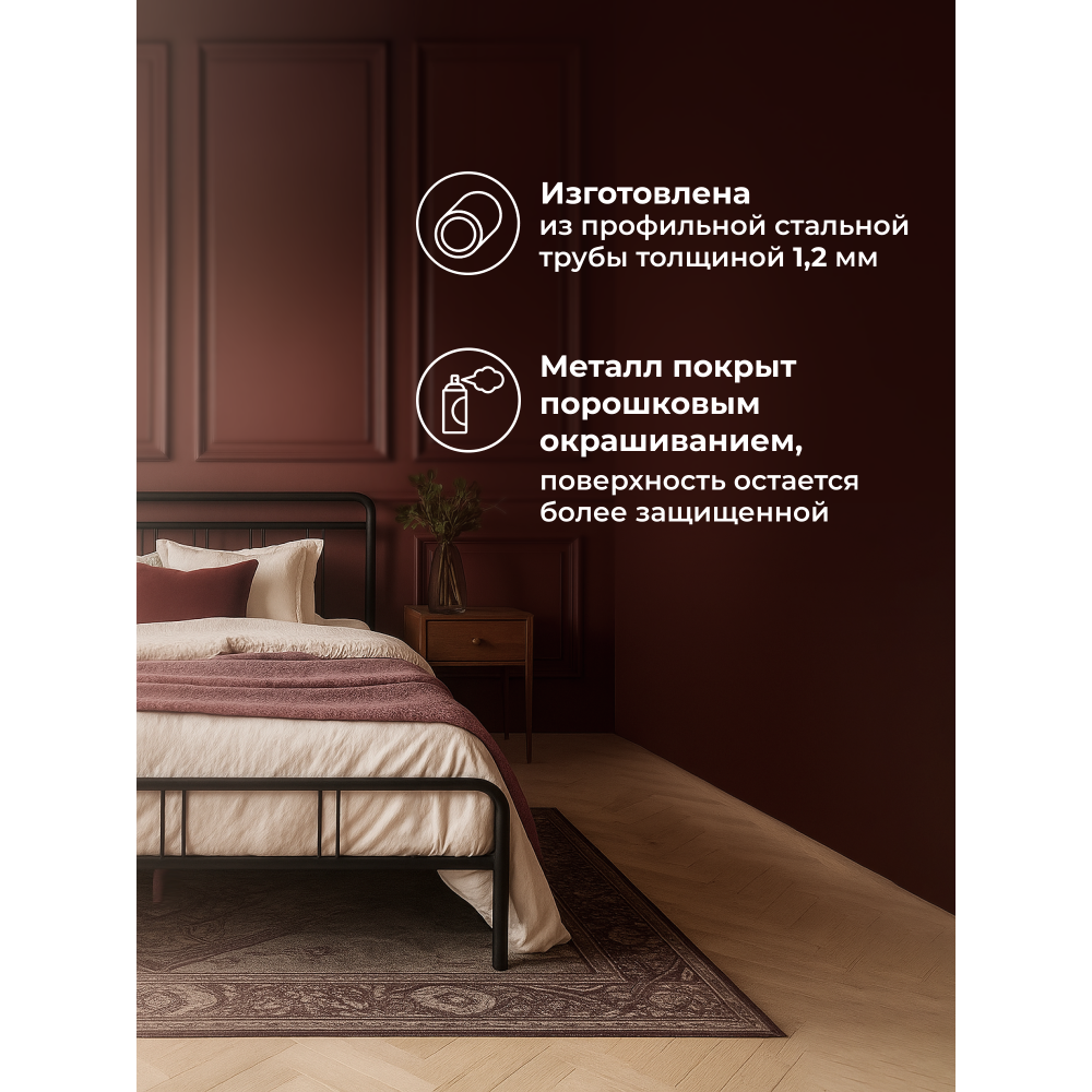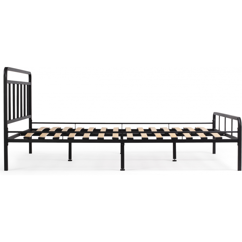 Материал каркаса - Металл; Материал ножек - Металл; Ортопедическое основание - в комплекте; Материал ортопедического основания - с деревянными ламелями; Цвет каркаса - Черный; Цвет ножек - Черный; Ширина - 126; Глубина - 206; Высота - 90,3; Размер спального места - 120 х 200; Длина кровати - 206; Ширина кровати - 126; Высота изножья - 46,3; Высота изголовья - 90,3.