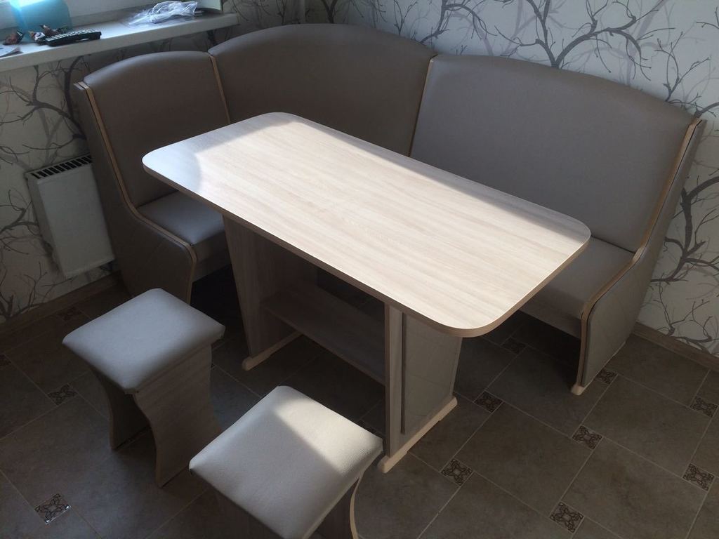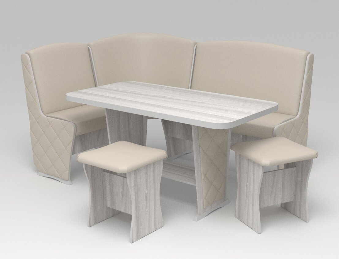 Кухонный уголок включает в себя угловой диван, обеденный стол и два табурета. Все детали кухонного гарнитура изготовлены из высококачественной ЛДСП, диван и табуретки обиты искусственной кожей. Скамья кухоннного уголка оснащена ящиком под сиденьем. Разнообразие цветов позволяет подобрать идеальный уголок для Вашей кухни. Выполнен из высококачественного материала. Товар сертифицирован.