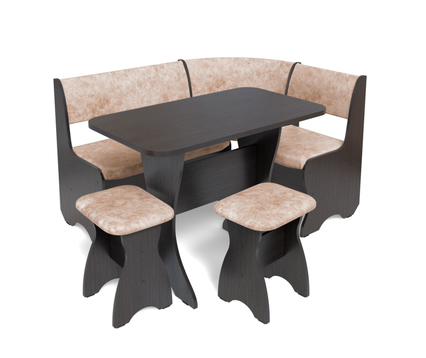 Набор мебели для кухни включающий в себя угловую скамью, стол и два табурета.