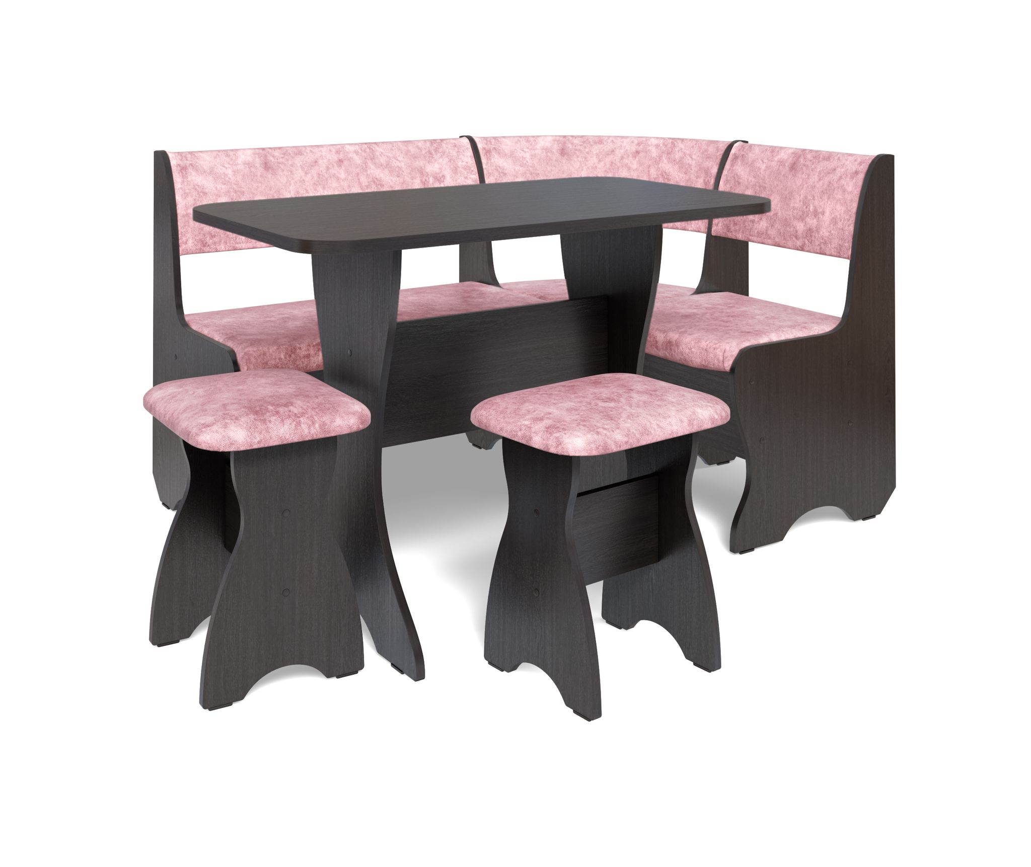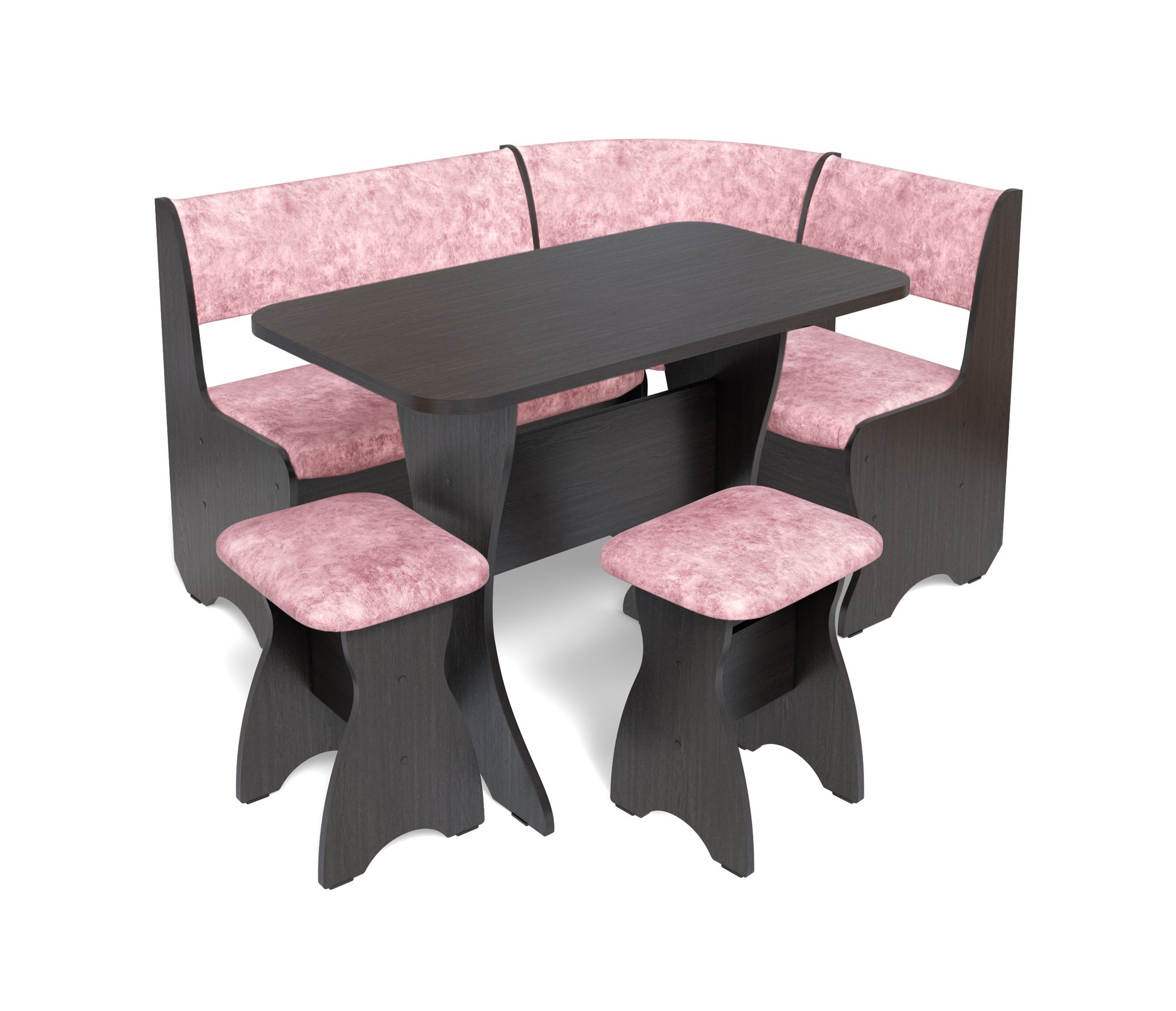 Набор мебели для кухни включающий в себя угловую скамью, стол и два табурета.