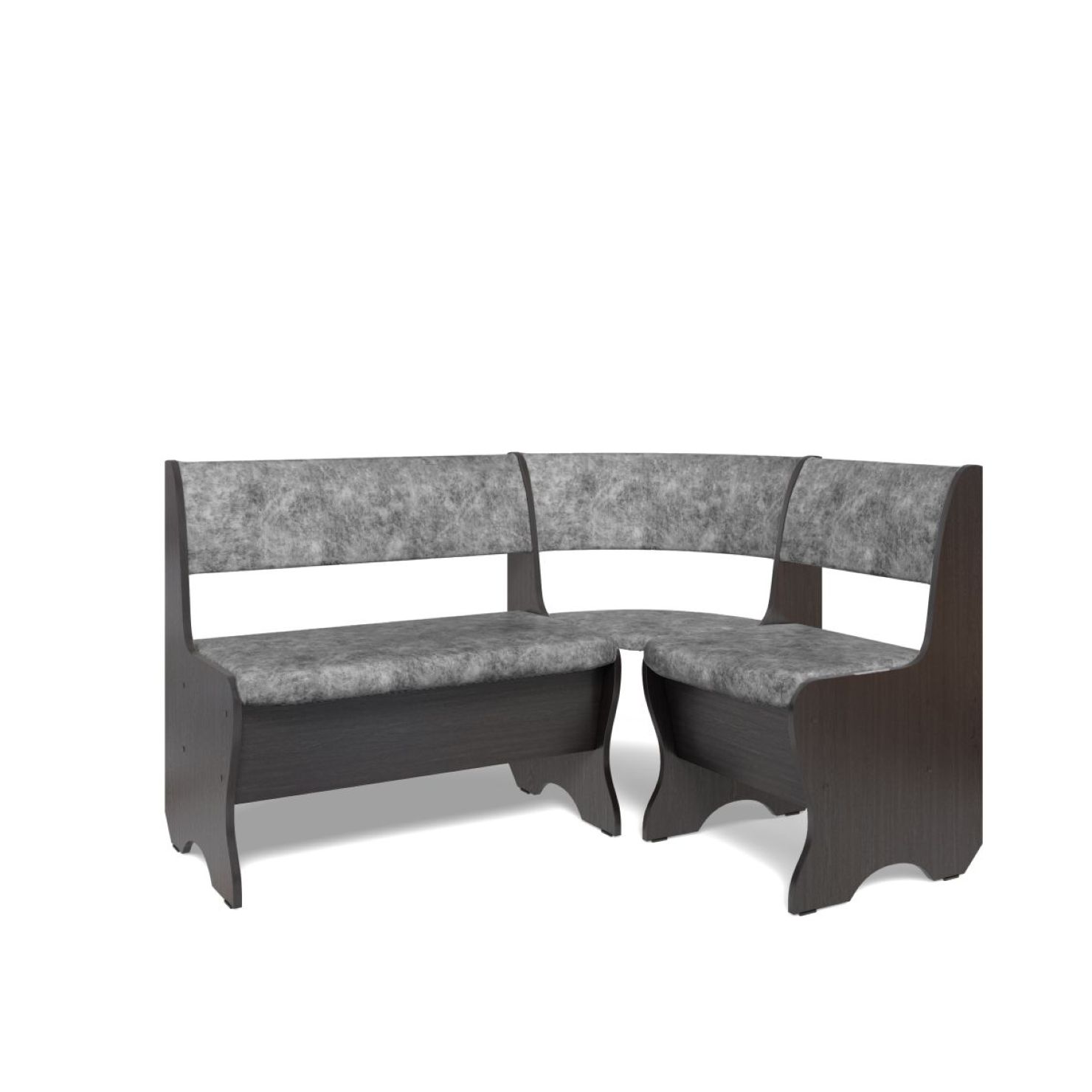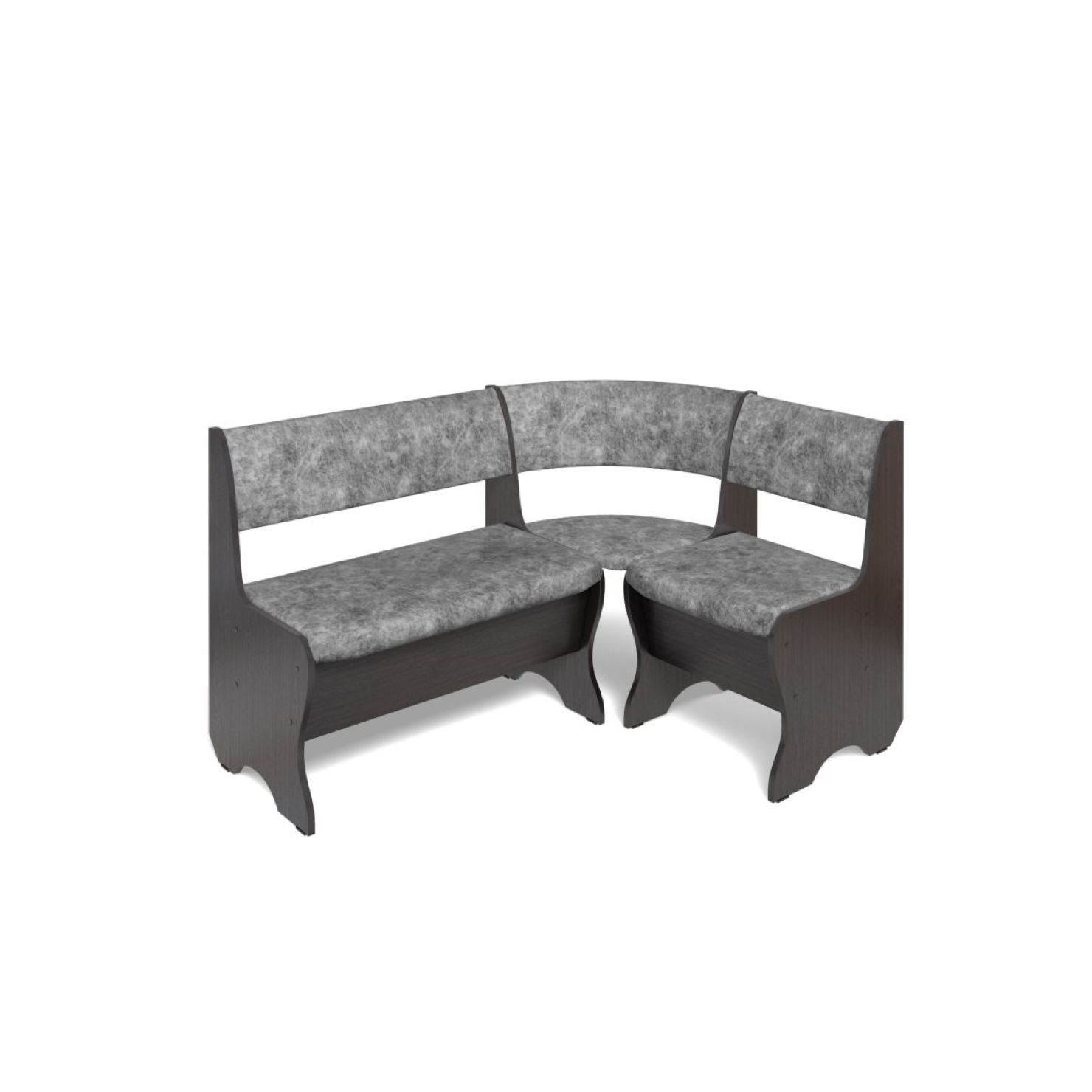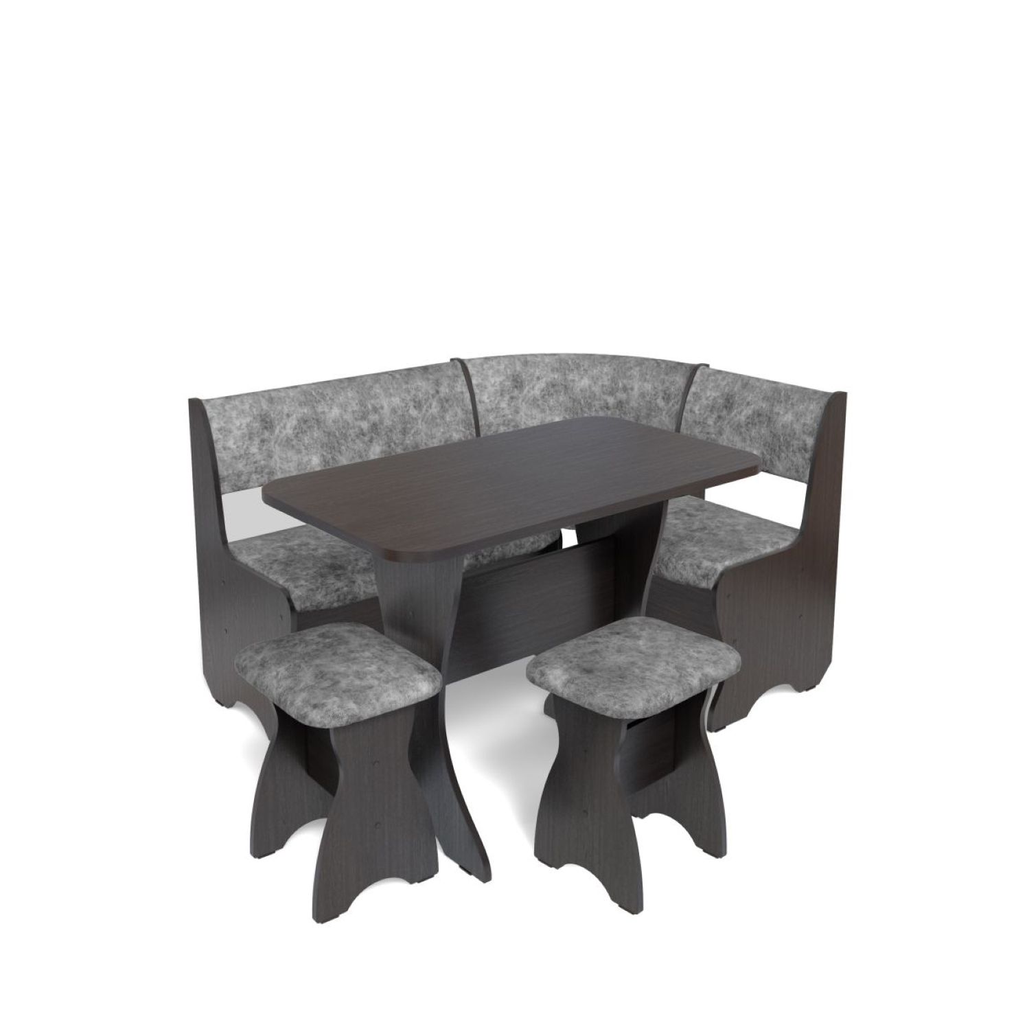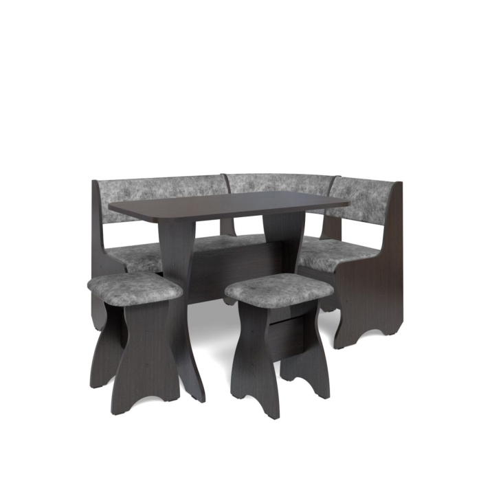 Набор мебели для кухни включающий в себя угловую скамью, стол и два табурета.